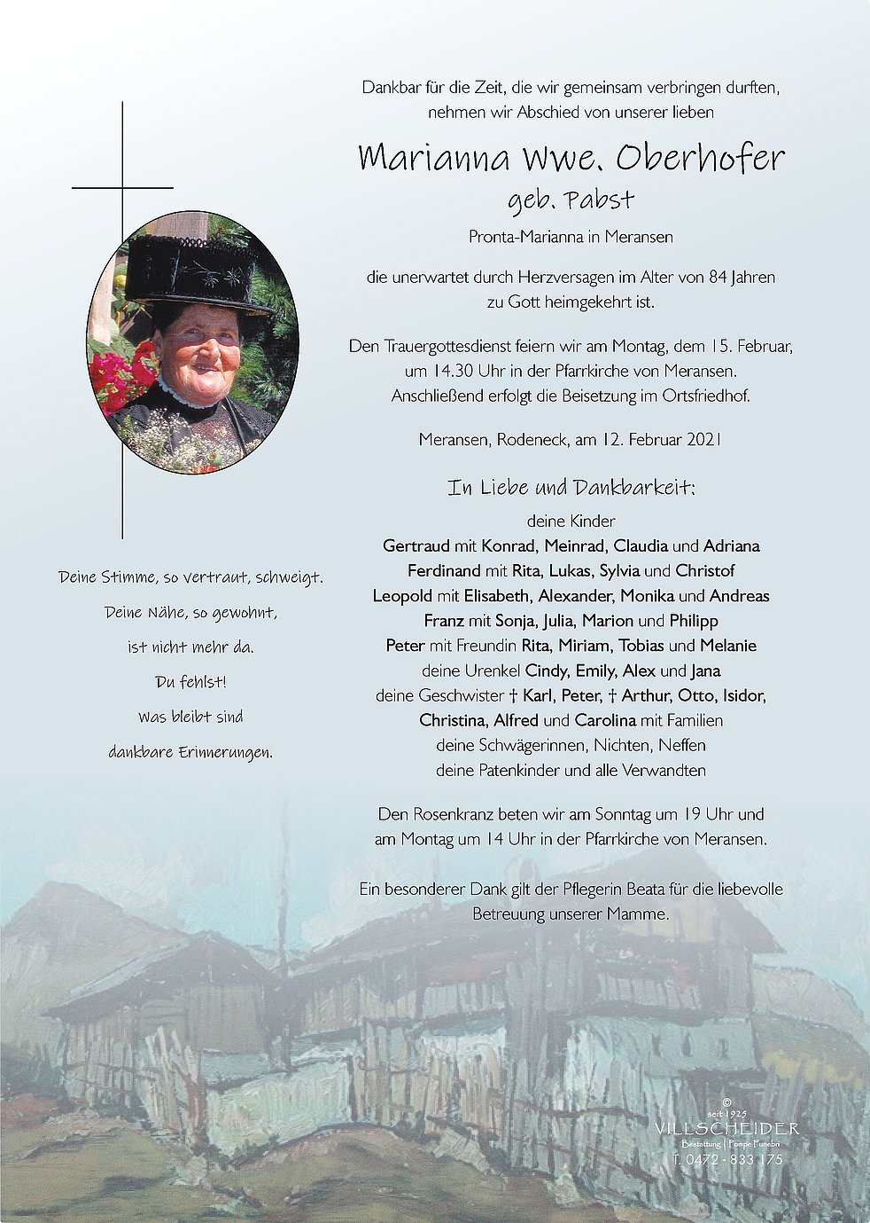 Vergelt`s Gott Marianna, möge der Herrgott Dir vergelten was Du für die Allegmeinheit Gutes getan hast, u.a. als Obfrau des KVW Meransen, in dieser Zeit durch Deine Initiative die WBG Greitenegg gegründet und dadurch vielen jungen Familie ein Eigenheim ermöglicht wurde.
