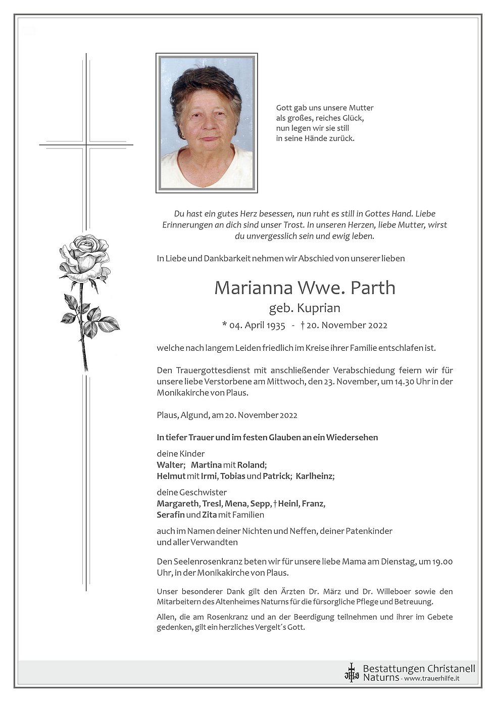 Den Trauergottesdienst mit anschließender Verabschiedung feiern wir für unsere liebe Verstorbene am Mittwoch, den 23. November, um 14.30 Uhr in der Monikakirche von Plaus.