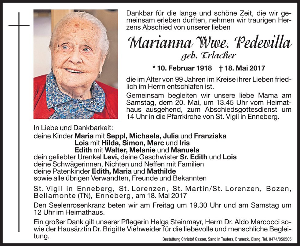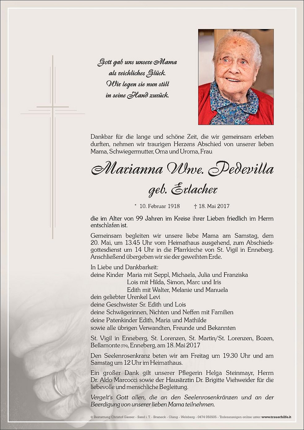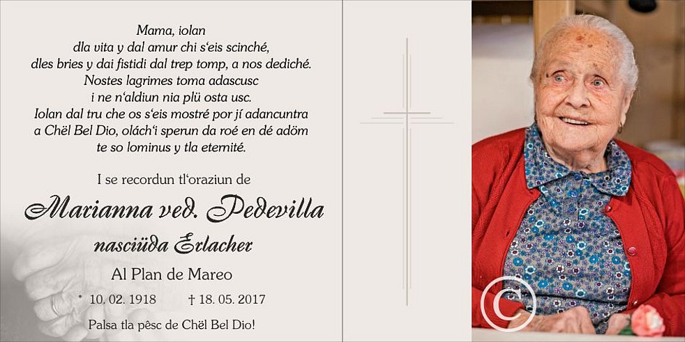 20. Mai, um 13.45 Uhr vom Heimathaus ausgehend, zum Abschiedsgottesdienst um 14 Uhr in die Pfarrkirche von St. Vigil in Enneberg. Anschließend übergeben wir sie der geweihten Erde.