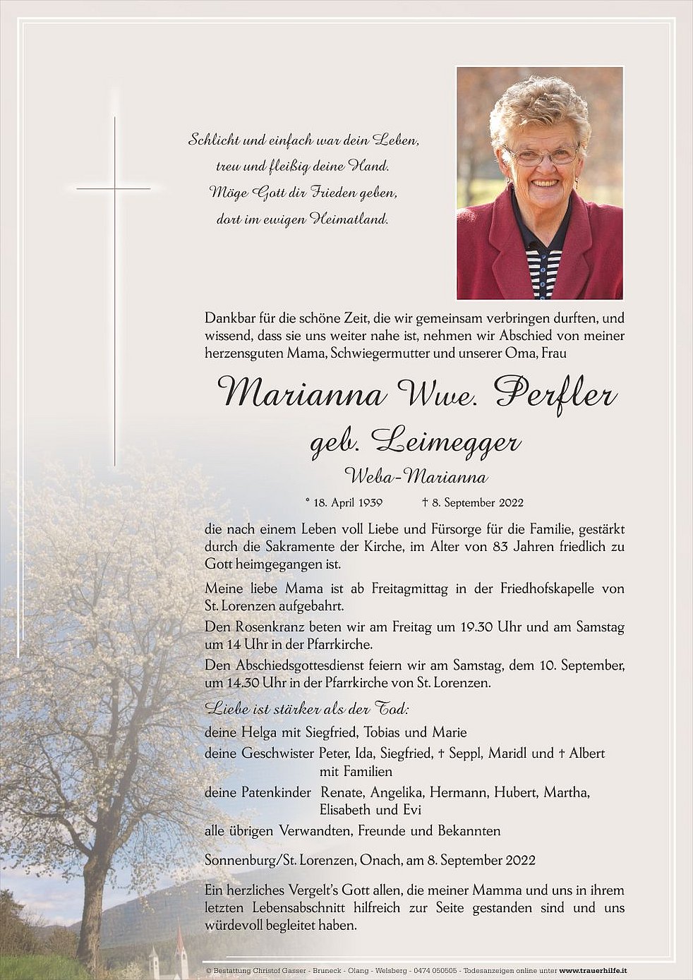 Meine liebe Mama ist ab Freitagmittag in der Friedhofskapelle von St. Lorenzen aufgebahrt.