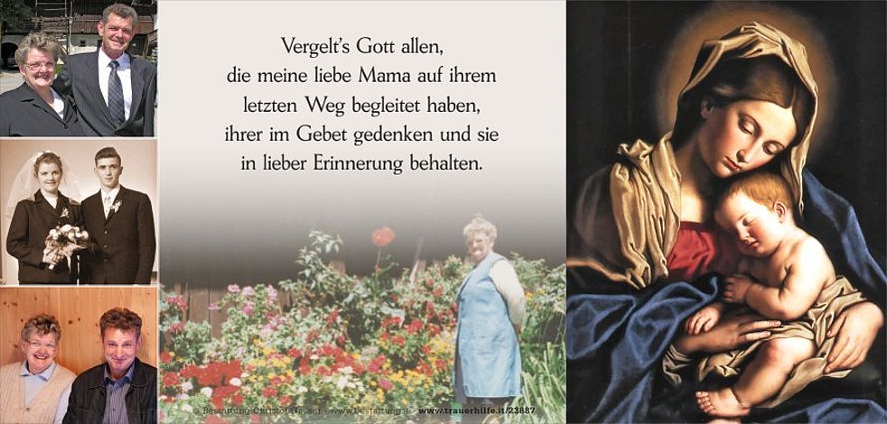 Ein herzliches Vergelt’s Gott allen, die meiner Mamma und uns in ihrem letzten Lebensabschnitt hilfreich zur Seite gestanden sind und uns würdevoll begleitet haben.