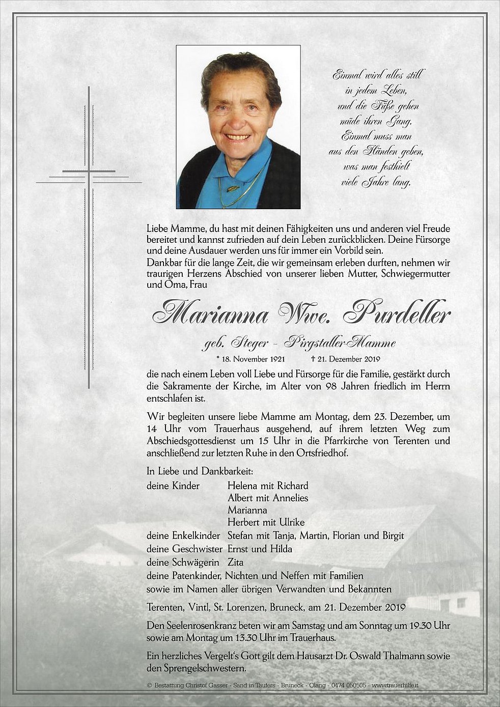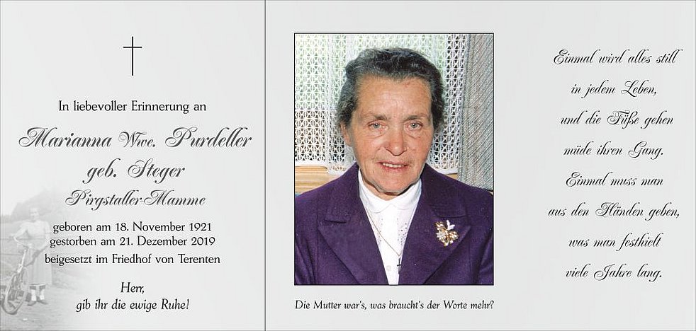 Wir begleiten unsere liebe Mamme am Montag, dem 23. Dezember, um 14 Uhr vom Trauerhaus ausgehend, auf ihrem letzten Weg zum Abschiedsgottesdienst um 15 Uhr in die Pfarrkirche von Terenten und anschließend zur letzten Ruhe in den Ortsfriedhof.