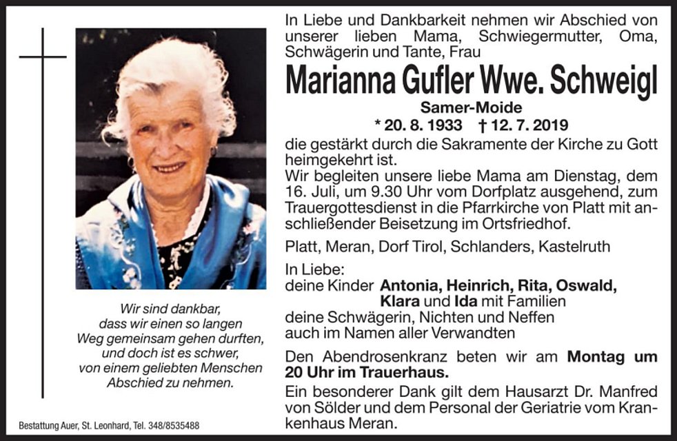 Wir begleiten unsere liebe Mama am Dienstag, dem 16. Juli, um 9.30 Uhr vom Dorfplatz ausgehend, zum Trauergottesdienst in die Pfarrkirche von Platt mit anschließender Beisetzung im Ortsfriedhof.