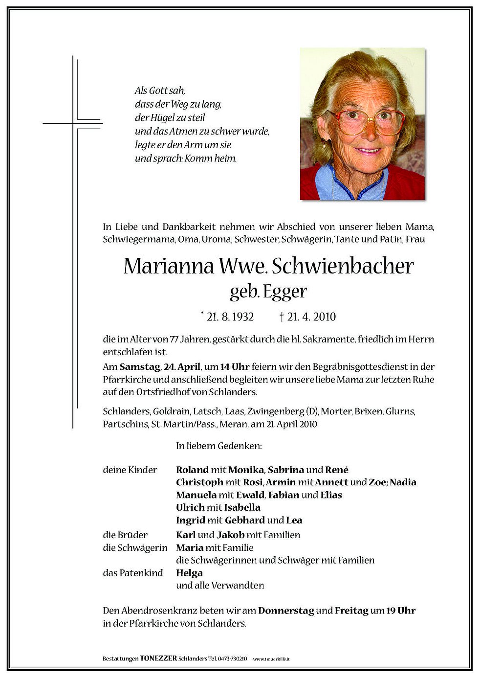Am Samstag, 24. April, um 14 Uhr feiern wir den Begräbnisgottesdienst in der Pfarrkirche und anschließend begleiten wir unsere liebe Mama zur letzten Ruhe auf den Ortsfriedhof von Schlanders.