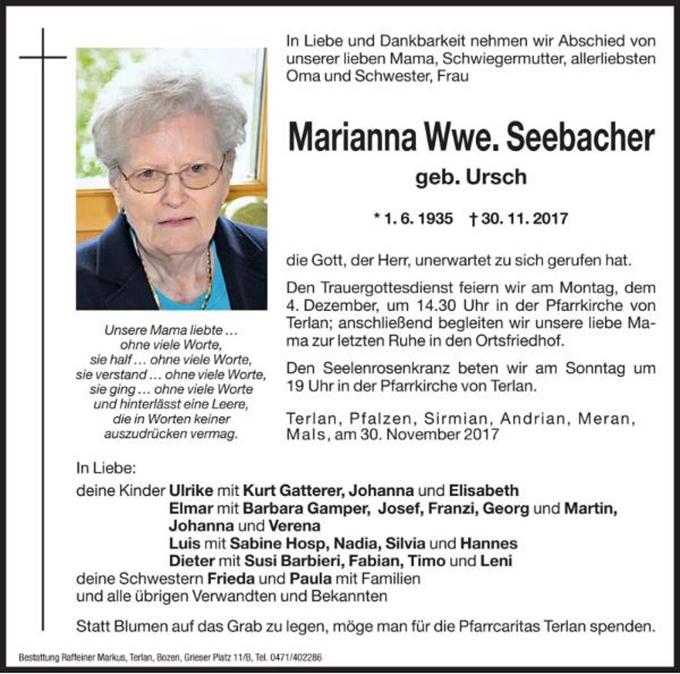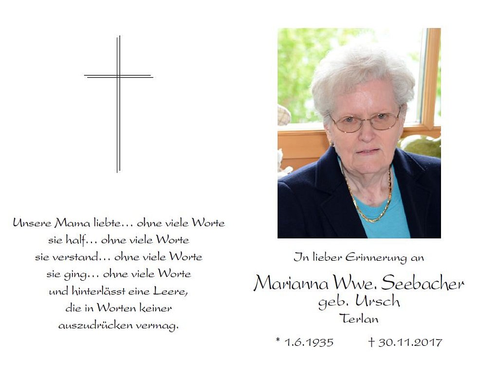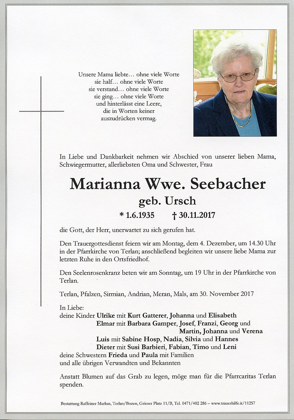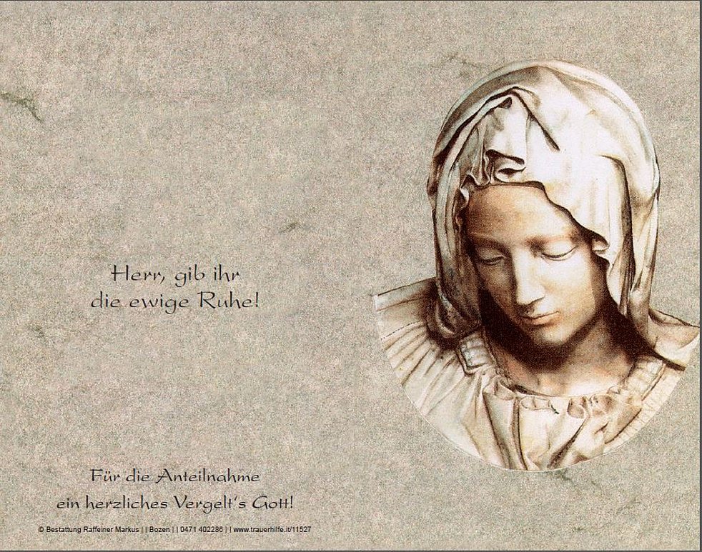 Den Trauergottesdienst feiern wir am Montag, dem 4. Dezember, um 14.30 Uhr in der Pfarrkirche von Terlan; anschließend begleiten wir unsere liebe Mama zur letzten Ruhe in den Ortsfriedhof.