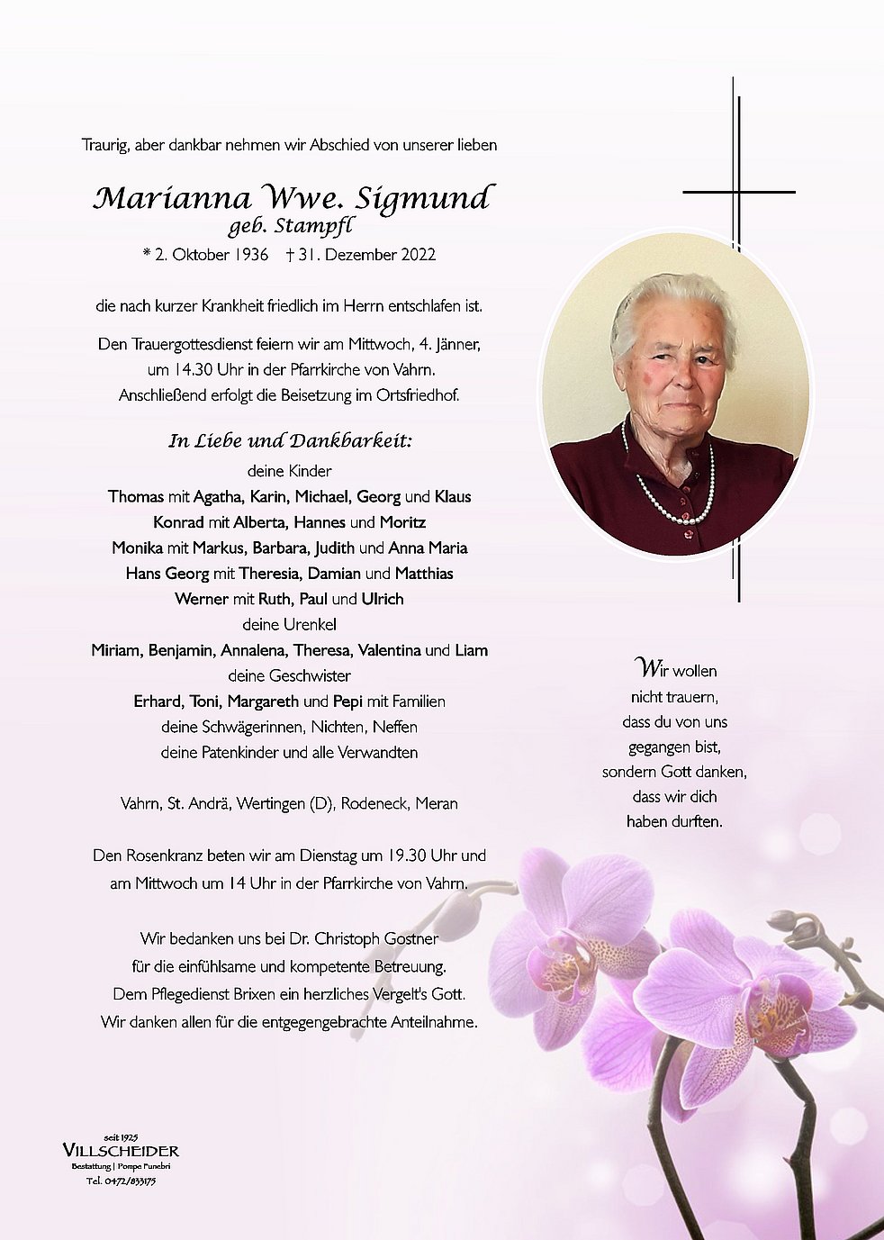 Lieber Konrad und Alberta, liebe Trauerfamilie. Wir sind mit unseren Müttern tief und fest verbunden und immer stirbt auch ein kleiner Teil von uns mit Ihnen, niemals jedoch die gemeinsame Zeit. Wir sind im Gedanken bei euch. Brigitte und Peter
