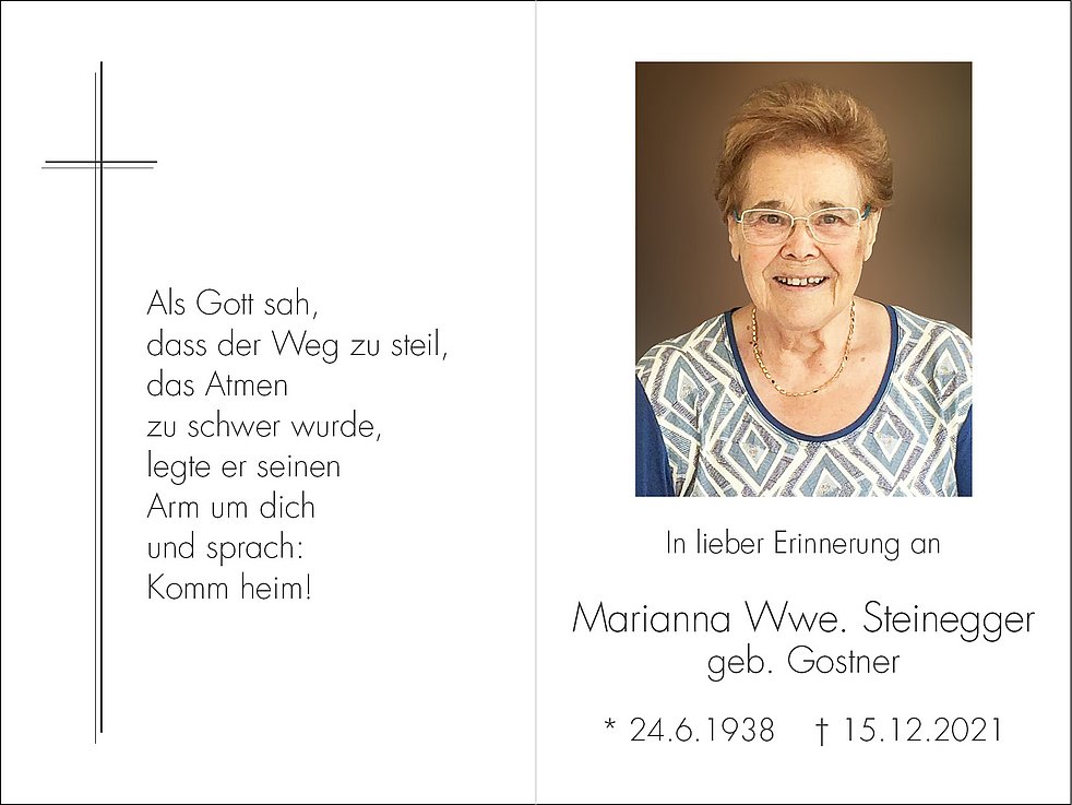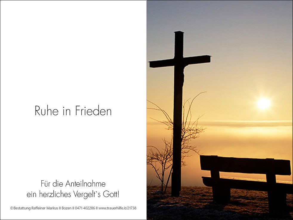 Wir begleiten unsere liebe Mama am Samstag, dem 18. Dezember, um 14.30 Uhr von der Leichenkapelle ausgehend zum Trauergottesdienst in die Pfarrkirche von Siebeneich und anschließend zur Einsegnung in den Ortsfriedhof.