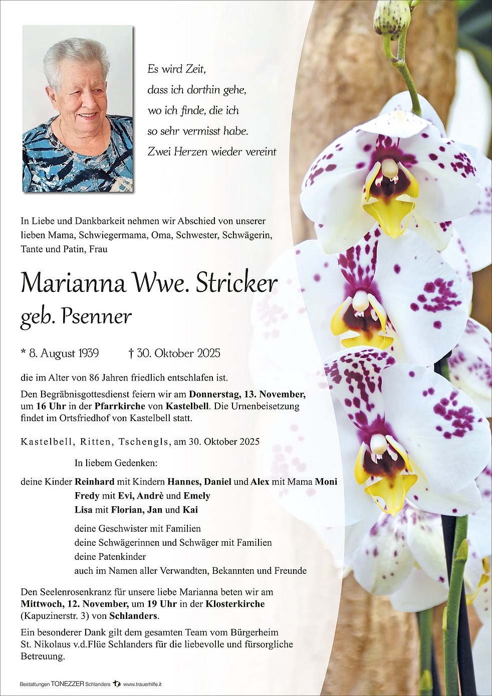Den Begräbnisgottesdienst feiern wir am Donnerstag, 13. November, um 14.30 Uhr in der Pfarrkirche von Kastelbell. Die Urnenbeisetzung findet im Ortsfriedhof von Kastelbell statt.
