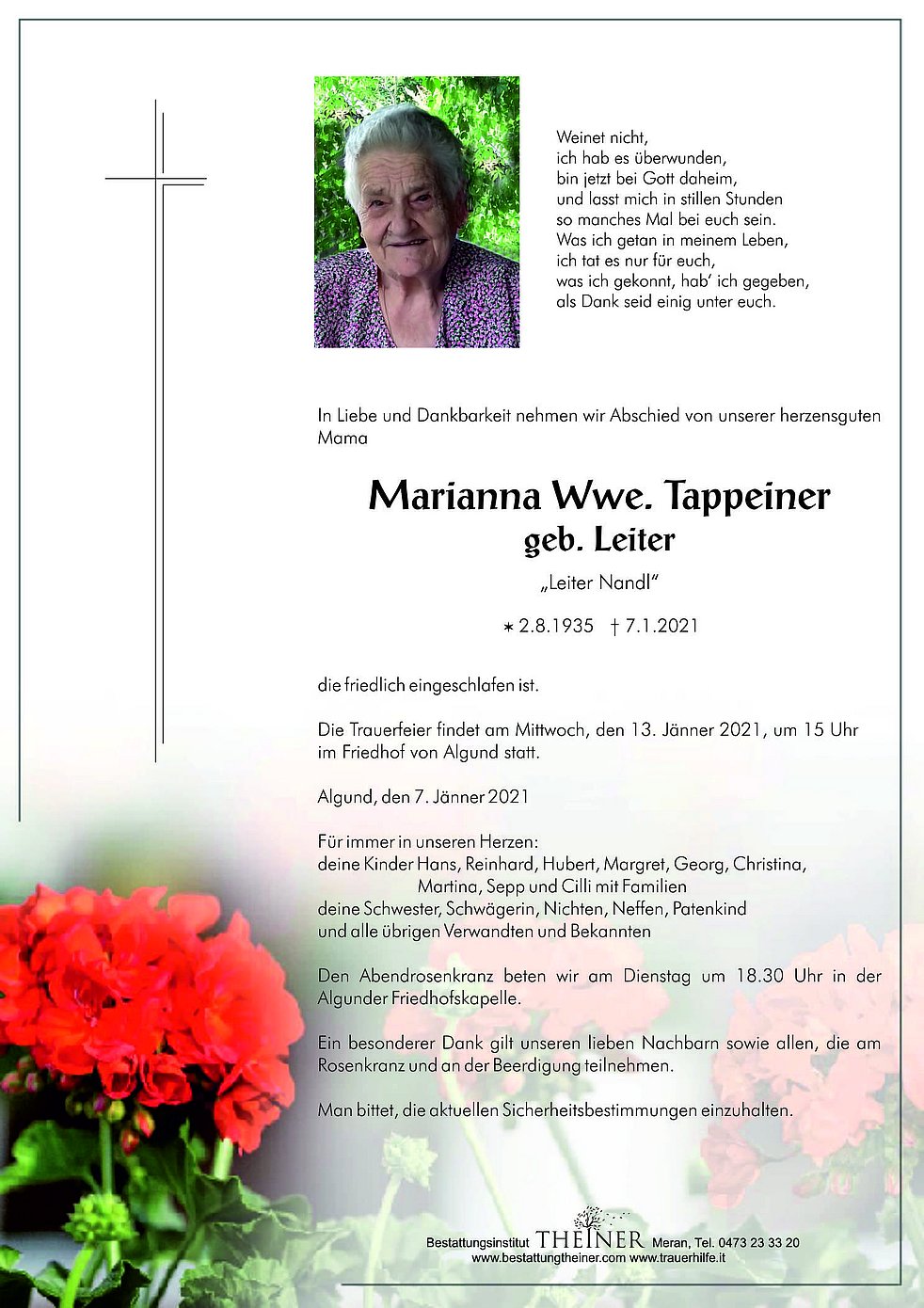 Die Trauerfeier findet am Mittwoch, den 13. Jänner 2021, um 15 Uhr im Friedhof von Algund statt.
