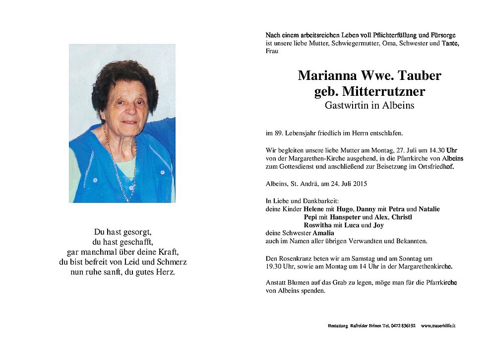 Wir begleiten unsere liebe Mutter am Montag, 27. Juli um 14.30 Uhr von der Margarethen-Kirche ausgehend, in die Pfarrkirche von Albeins zum Gottesdienst und anschließend zur Beisetzung im Ortsfriedhof.