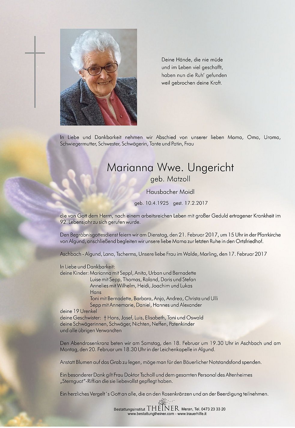 von Algund, anschließend begleiten wir unsere liebe Mama zur letzten Ruhe in den Ortsfriedhof.