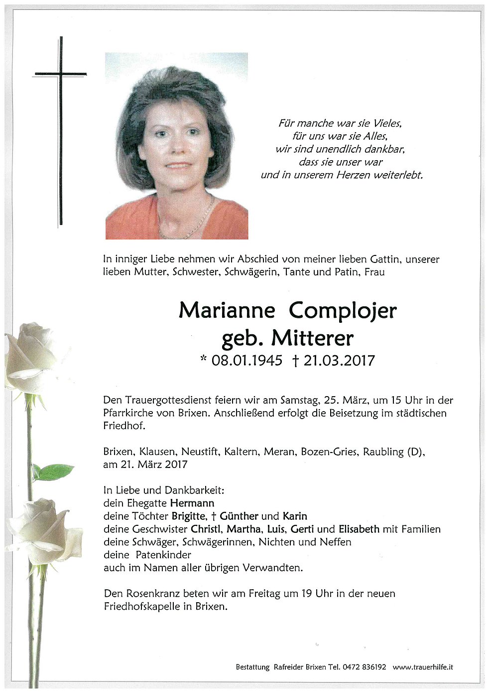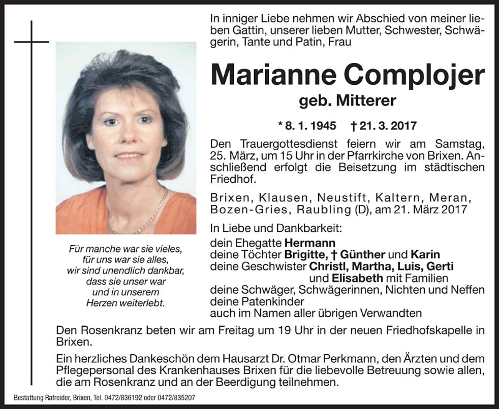 Den Trauergottesdienst feiern wir am Samstag, 25. März, um 15 Uhr in der Pfarrkirche von Brixen. Anschließend erfolgt die Beisetzung im städtischen Friedhof.