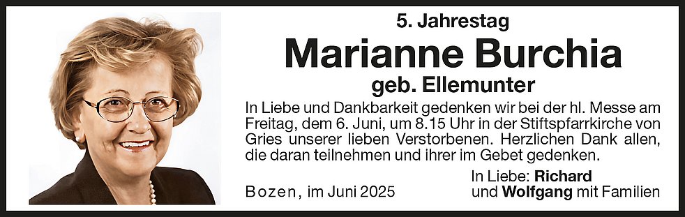 La S. Messa in suffragio verrà celebrata giovedì 11 giugno alle ore 10.30 nella chiesa parrocchiale di Gries.