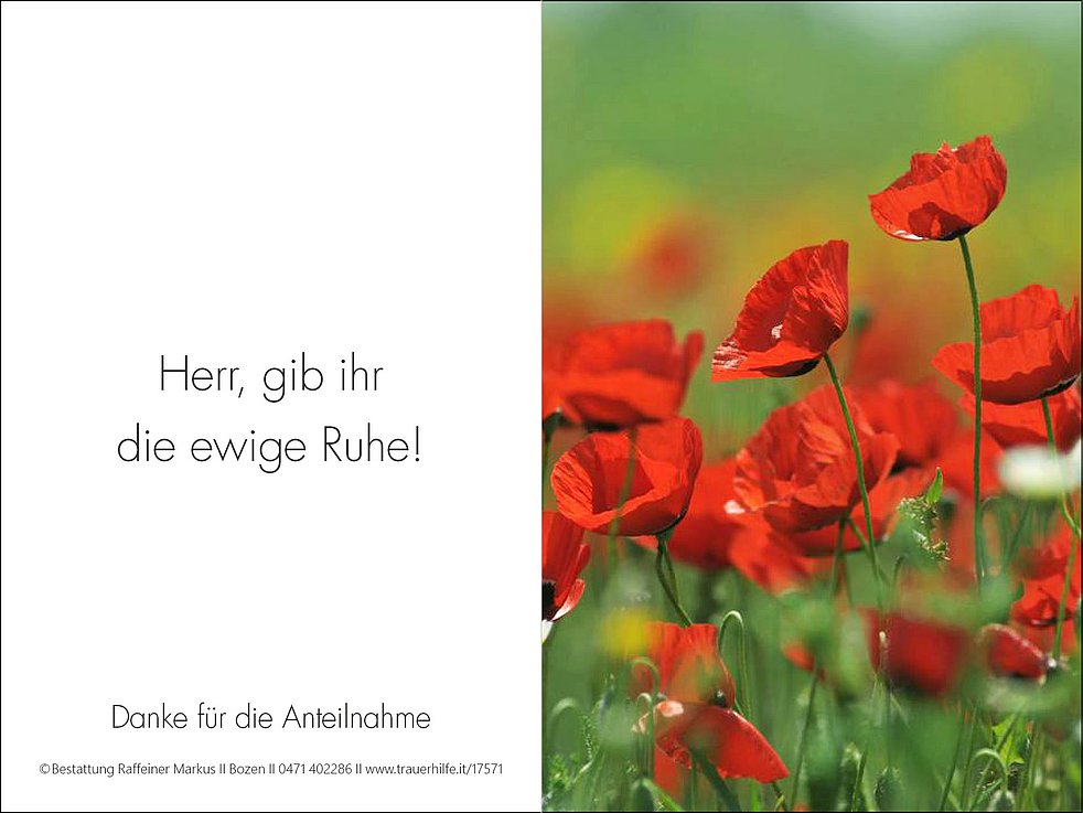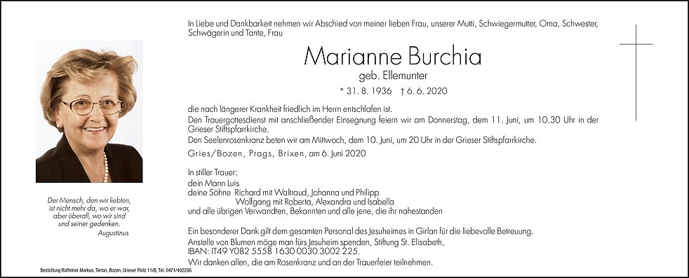 Non fiori, ma eventuali offerte al Jesuheim, Stiftung St. Elisabeth, IBAN: IT49 Y082 5558 1630 0030 3002 225