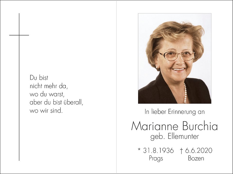 Un sentito ringraziamento a tutti coloro che ricorderanno la nostra cara Marianne nelle loro preghiere e a tutto il personale assistenziale del Jesuheim a Cornaiano per le amorevoli cure prestate.