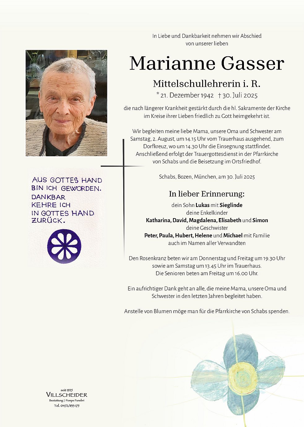 Begräbnisgottesdienst: 02.08. - 14:30 Uhr Schabs