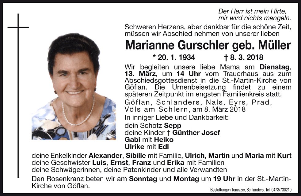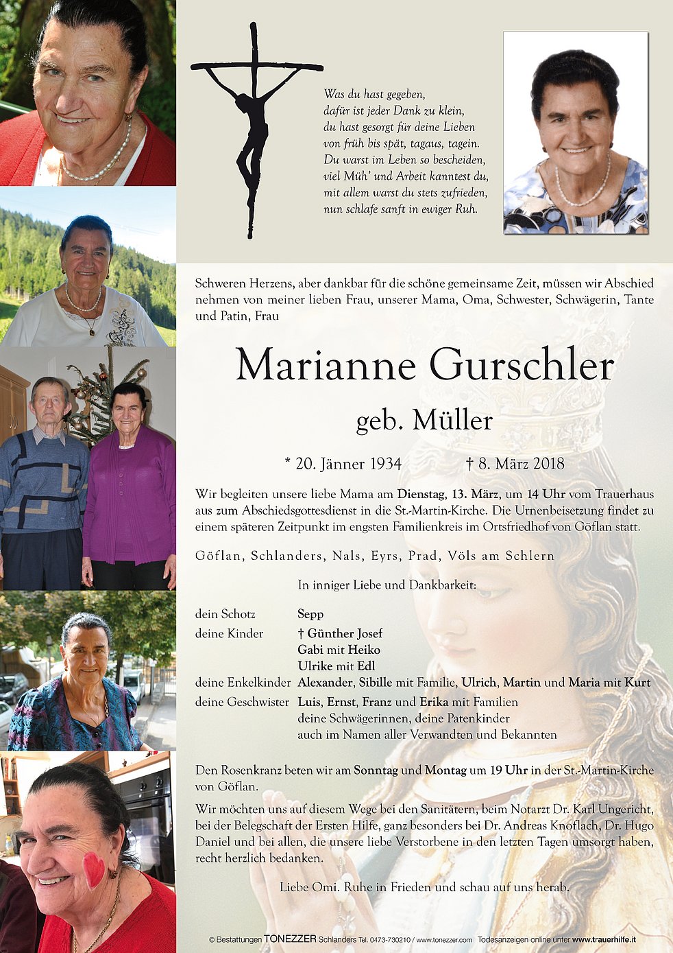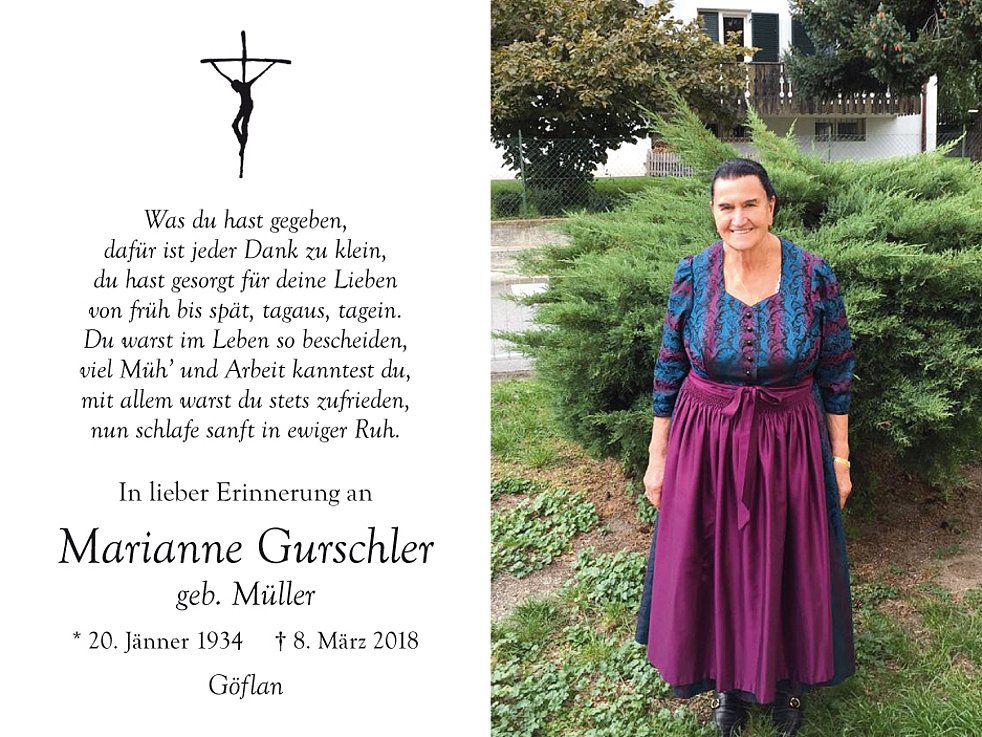Wir möchten uns auf diesem Wege bei den Sanitätern, beim Notarzt Dr. Karl Ungericht, bei der Belegschaft der Ersten Hilfe, ganz besonders bei Dr. Andreas Knoflach, Dr. Hugo Daniel und bei allen, die unsere liebe Verstorbene in den letzten Tagen umsorgt haben, recht herzlich bedanken.