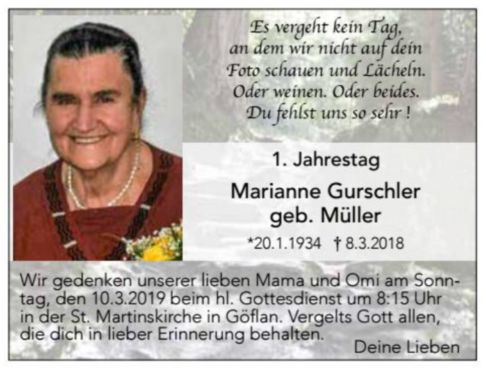Wir begleiten unsere liebe Mama am Dienstag, 13. März, um 14 Uhr vom Trauerhaus aus zum Abschiedsgottesdienst in die St.-Martin-Kirche. Die Urnenbeisetzung findet zu einem späteren Zeitpunkt im engsten Familienkreis im Ortsfriedhof von Göflan statt.