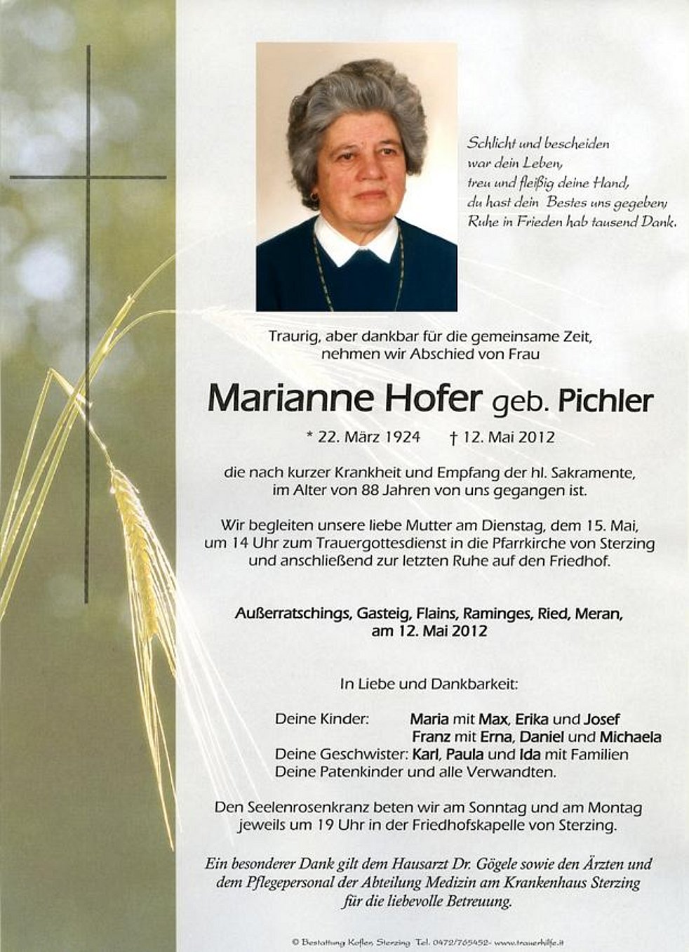 Ein besonderer Dank gilt dem Hausarzt Dr. Gögele sowie den Ärzten und dem Pflegepersonal der Abteilung Medizin am Krankenhaus Sterzing für die liebevolle Betreuung.