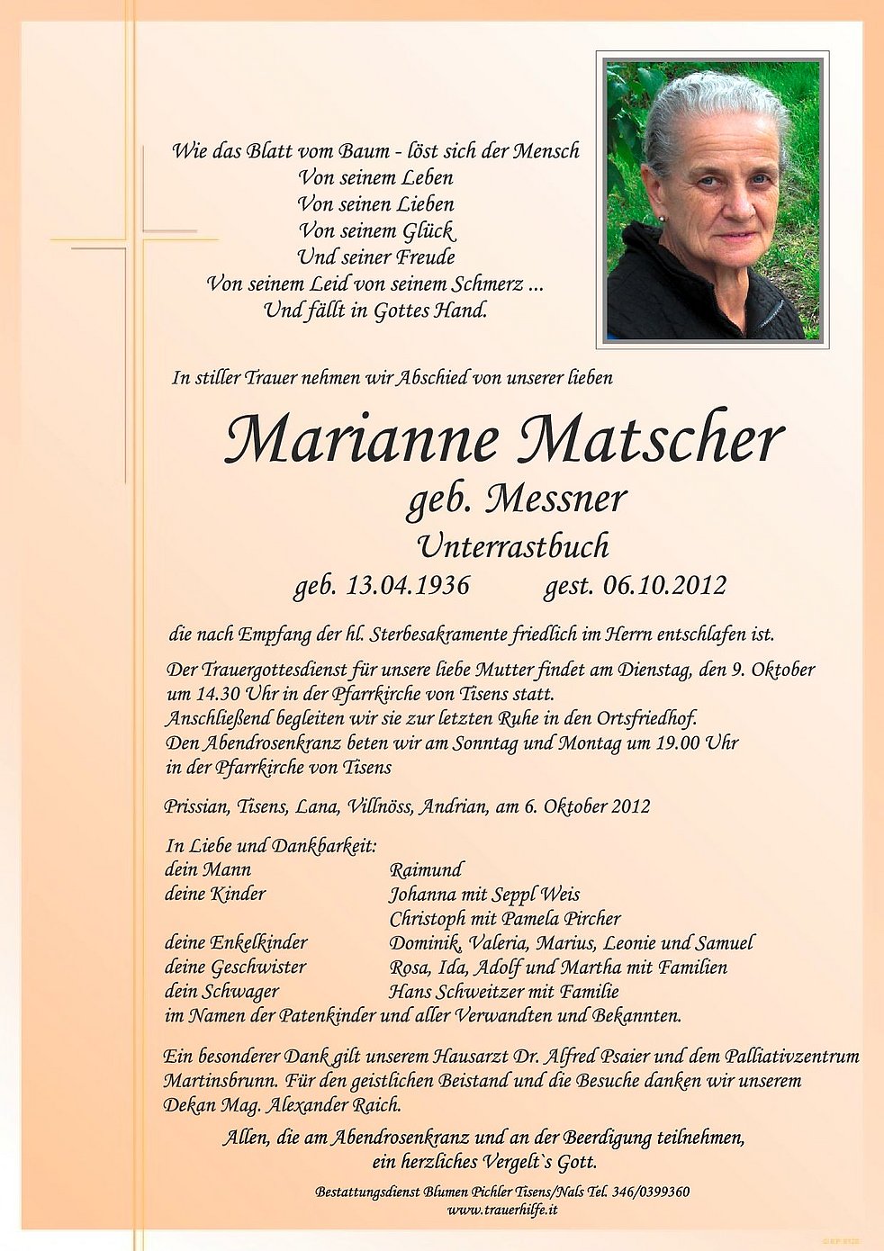 Der Trauergottesdienst für unsere liebe Mutter findet am Dienstag, den 9. Oktober