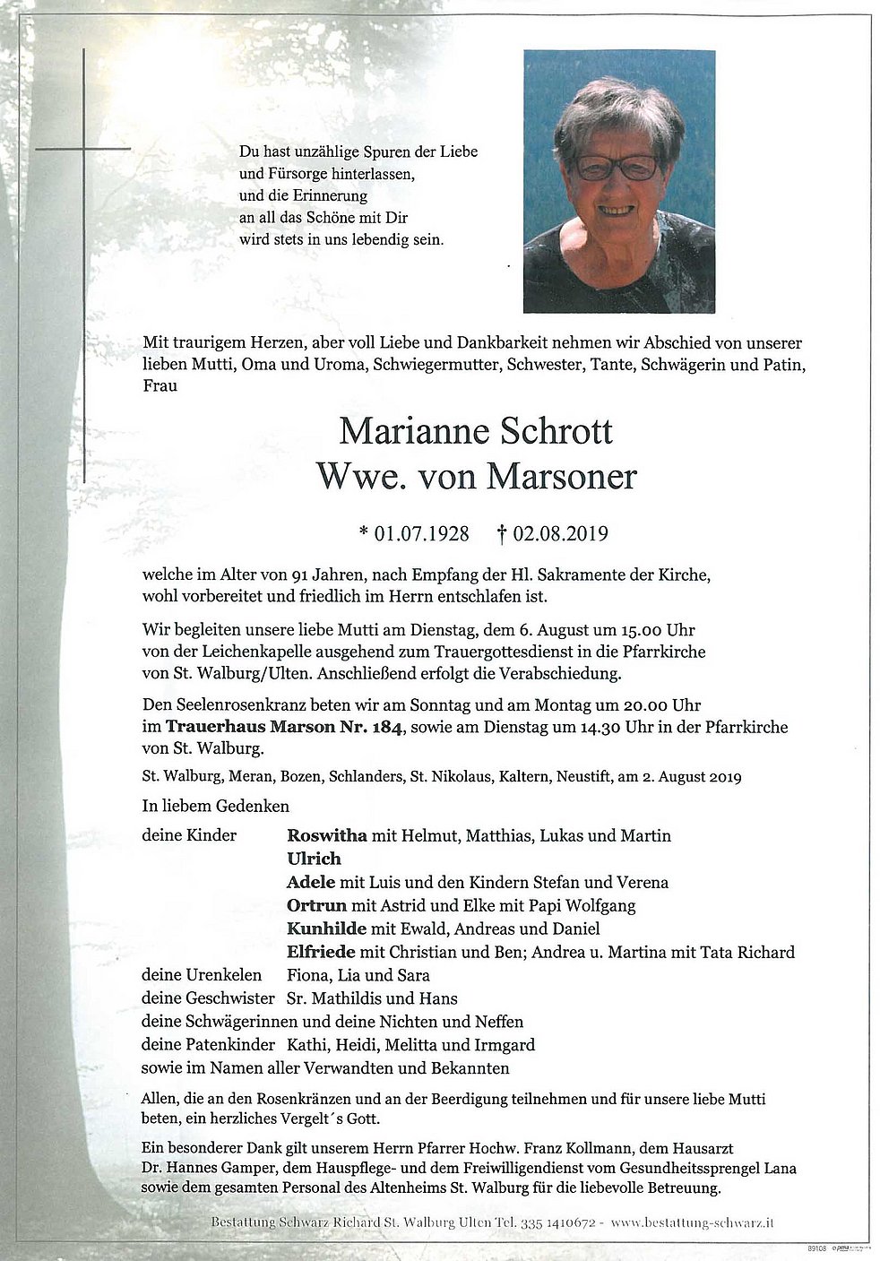 Liebe Adele! Mir drücken dir inser inniges u.aufrichtiges Mitgefühl aus,wünschen dir u. deiner Fam.gonz viel Kroft u.gonz viele schiane Erinnerungen von deiner Mamma !Adele ,i druck di gonz fest! Mary u.Werner Martell