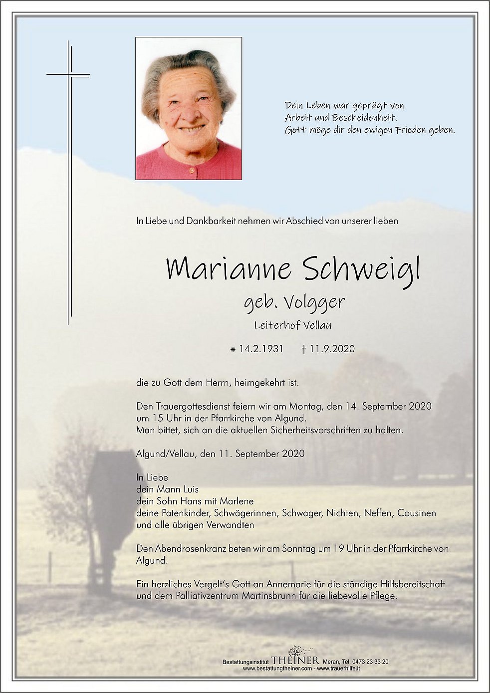 Den Trauergottesdienst feiern wir am Montag, den 14. September 2020 um 15 Uhr in der Pfarrkirche von Algund.