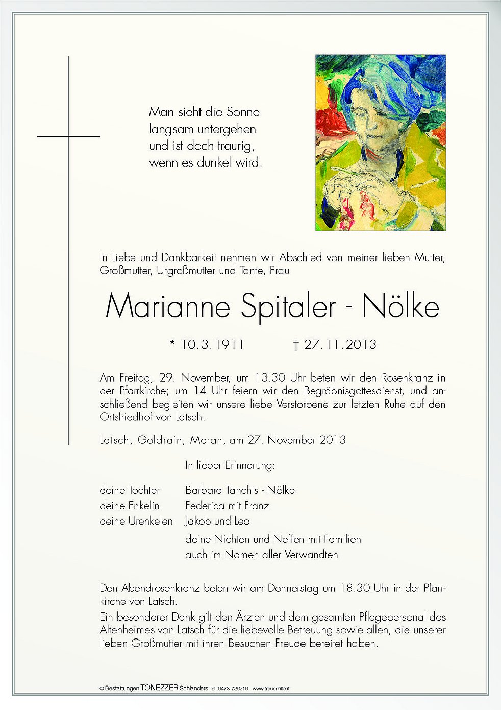 Am Freitag, 29. November, um 13.30 Uhr beten wir den Rosenkranz in der Pfarrkirche; um 14 Uhr feiern wir den Begräbnisgottesdienst, und an-schließend begleiten wir unsere liebe Verstorbene zur letzten Ruhe auf den Ortsfriedhof von Latsch.