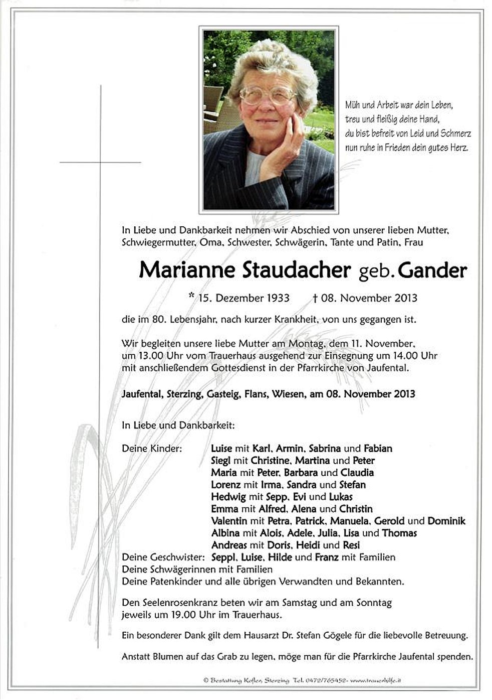 Anstatt Blumen auf das Grab zu legen, möge man für die Pfarrkirche Jaufental spenden.
