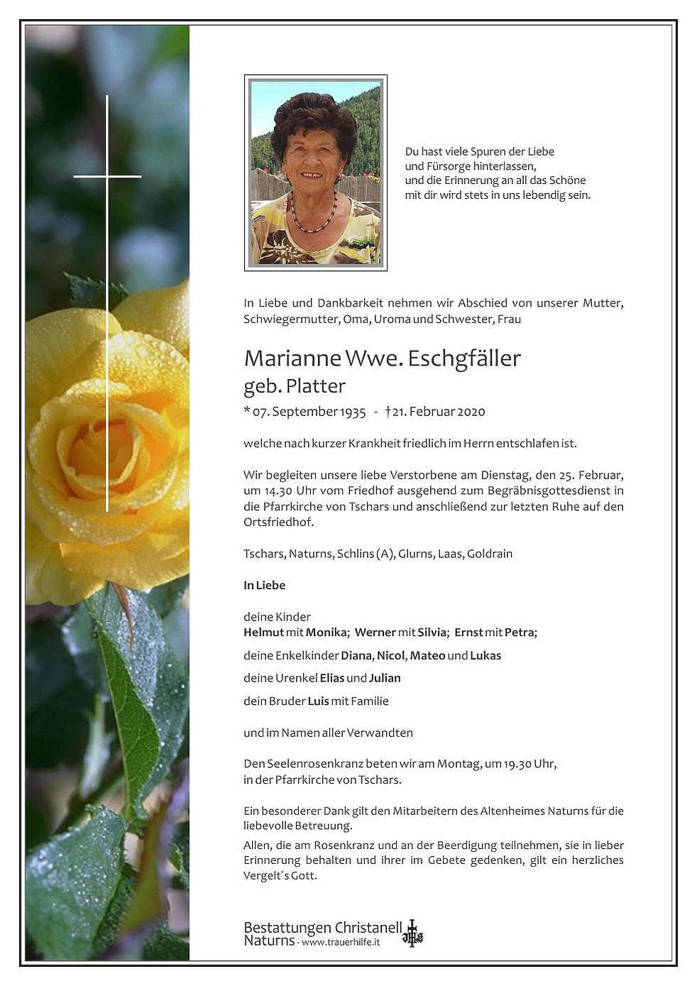 Wir begleiten unsere liebe Verstorbene am Dienstag, den 25. Februar, um 14.30 Uhr vom Friedhof ausgehend zum Begräbnisgottesdienst in die Pfarrkirche von Tschars und anschließend zur letzten Ruhe auf den Ortsfriedhof.