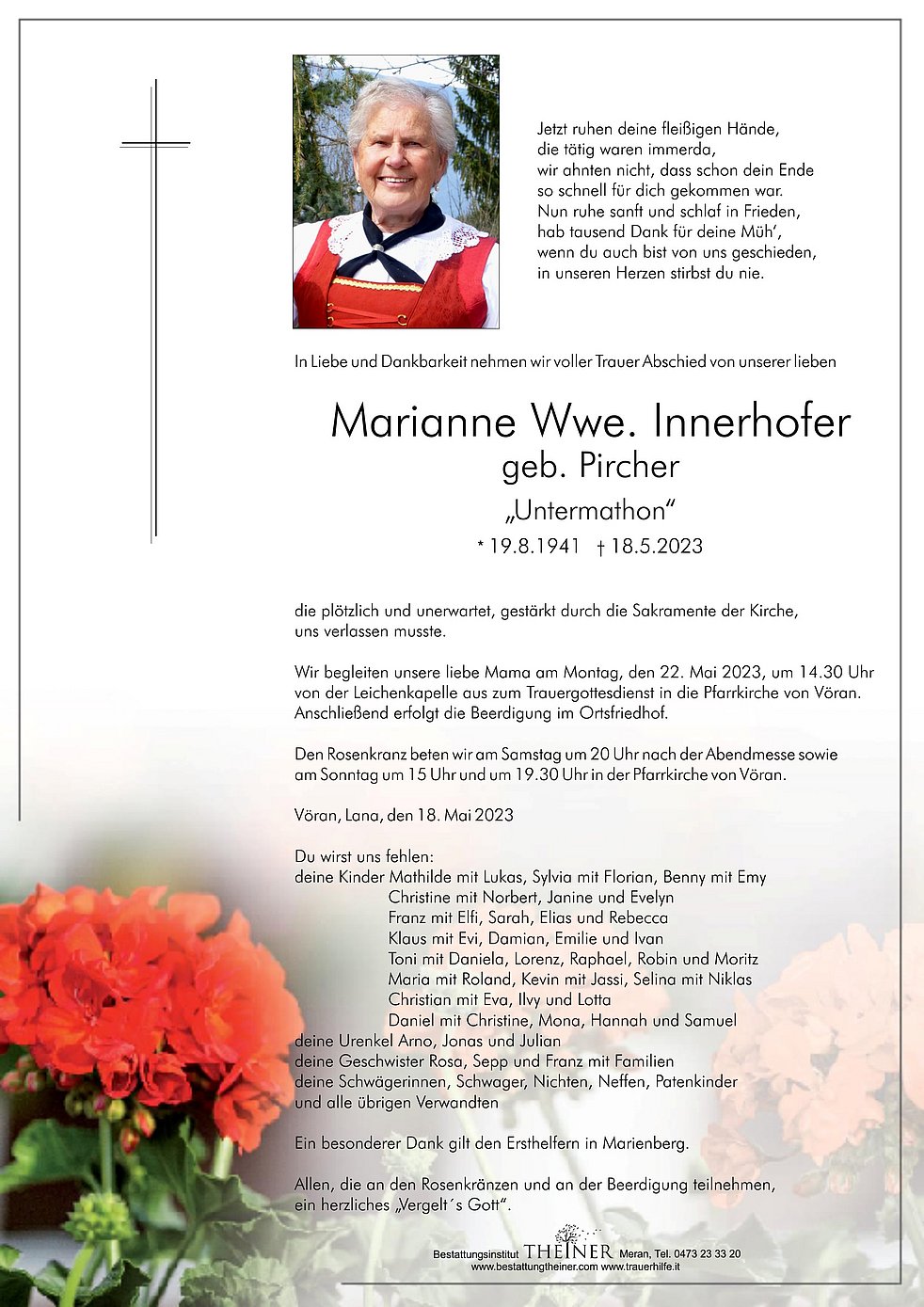 Wir begleiten unsere liebe Mama am Montag, den 22. Mai 2023, um 14.30 Uhr von der Leichenkapelle aus zum Trauergottesdienst in die Pfarrkirche von Vöran. Anschließend erfolgt die Beerdigung im Ortsfriedhof.