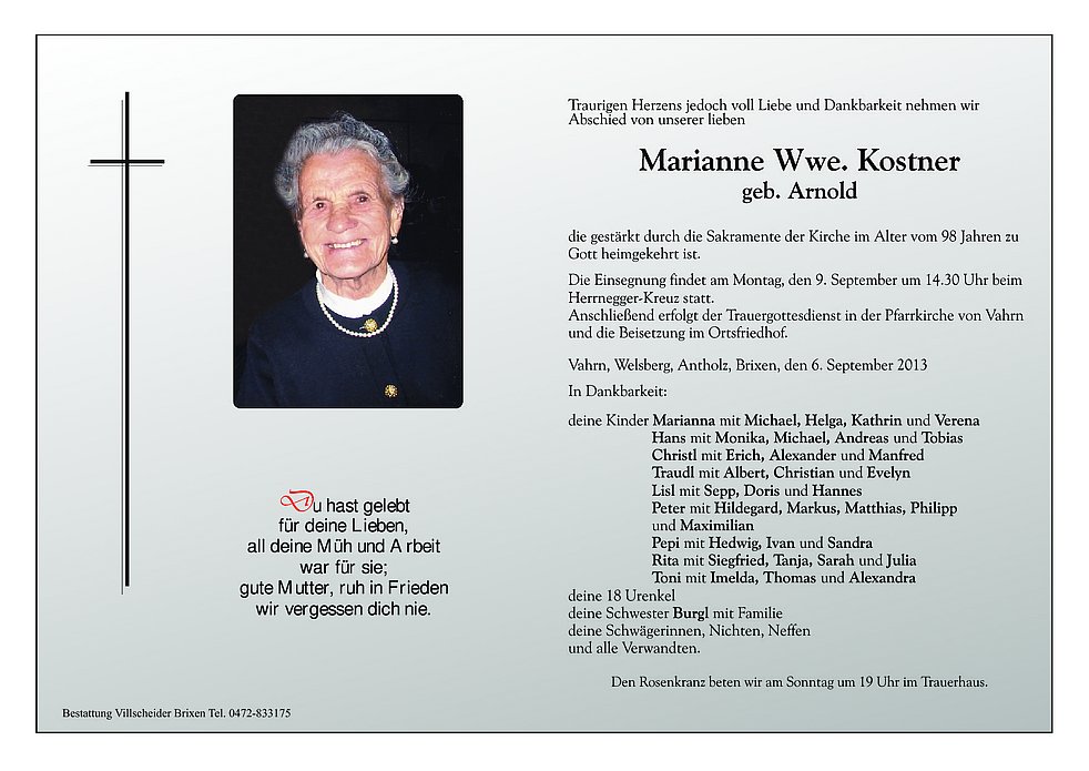 die gestärkt durch die Sakramente der Kirche im Alter vom 98 Jahren zu Gott heimgekehrt ist.