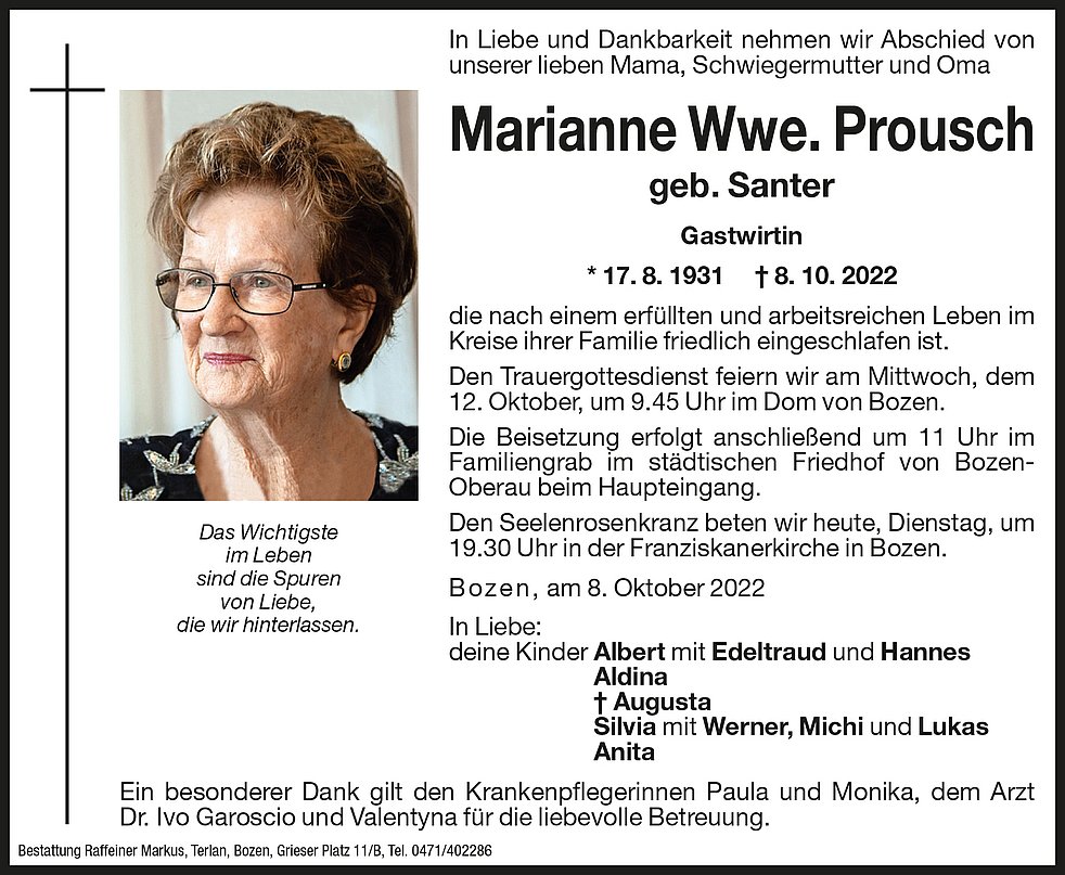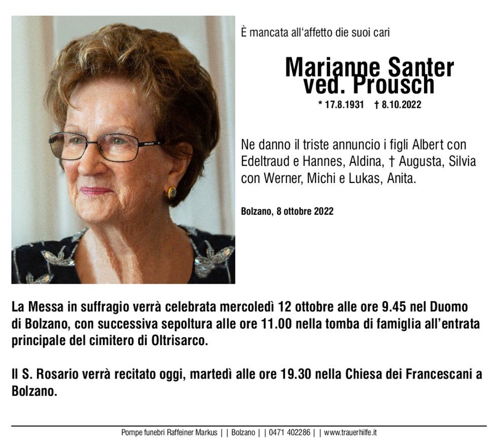 Den Trauergottesdienst feiern wir am Mittwoch, dem 12. Oktober, um 9.45 Uhr im Dom von Bozen. Die Beisetzung erfolgt anschließend um 11 Uhr im Familiengrab am städtischen Friedhof von Bozen Oberau beim Haupteingang.