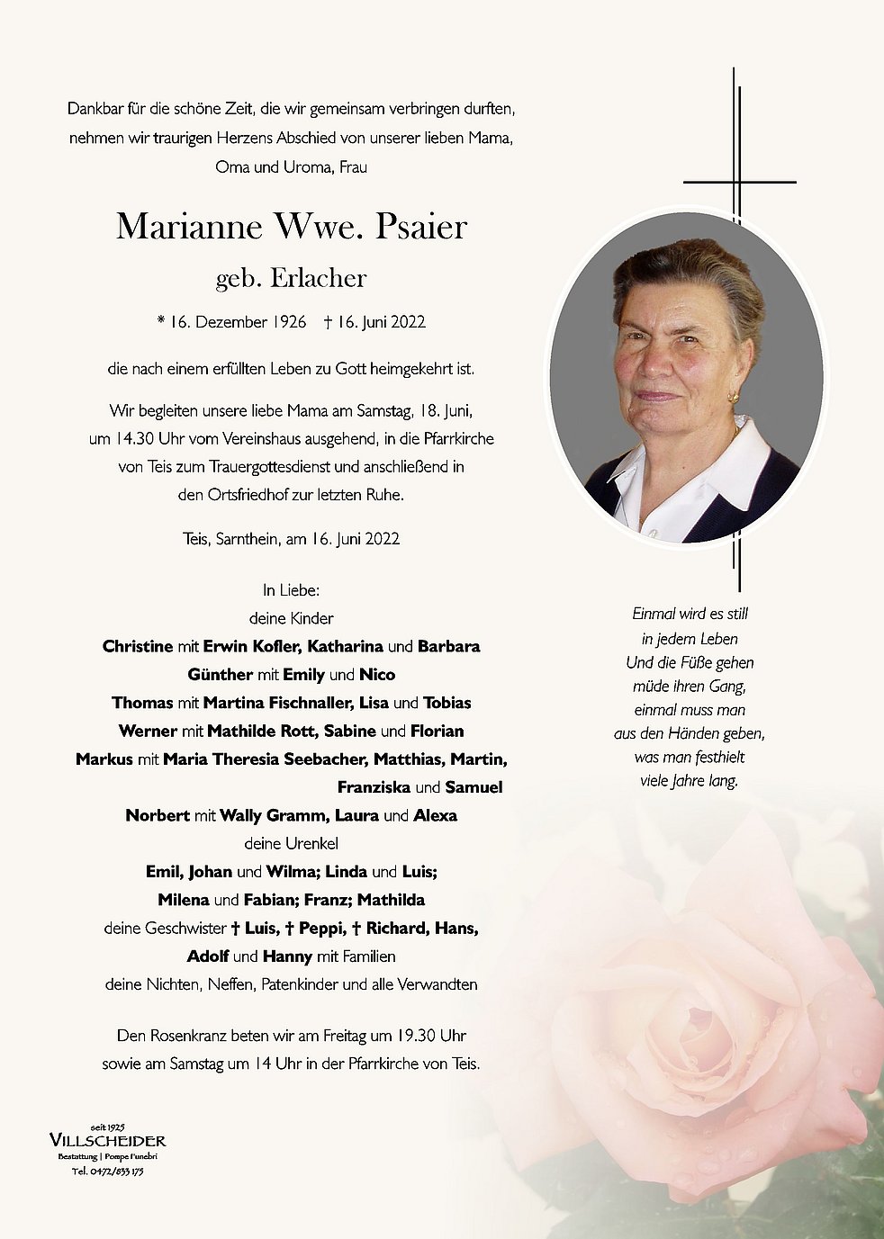 Liebe Marianne: Du wirst uns immer in unseren Herzen in schöner und guter Erinnerung bleiben! Du warst ein wunderbarer Mensch, den man einfach lieb haben musste.