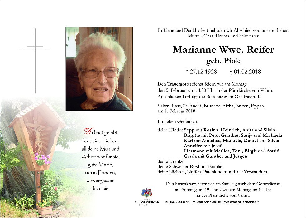 den 5. Februar, um 14.30 Uhr in der Pfarrkirche von Vahrn. Anschließend erfolgt die Beisetzung im Ortsfriedhof.