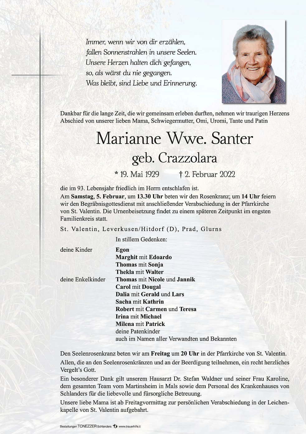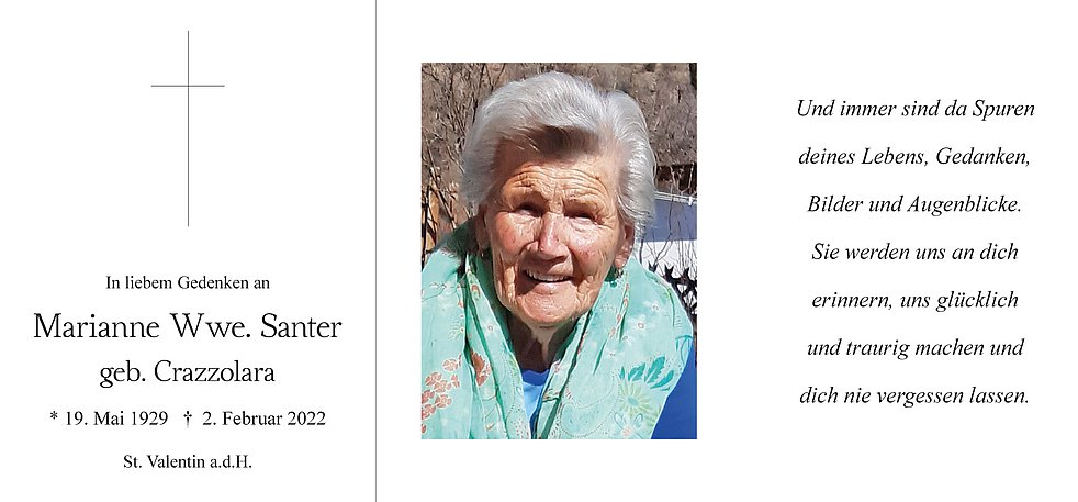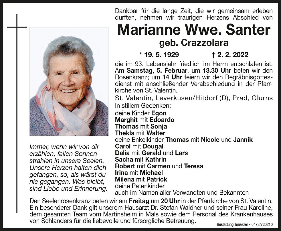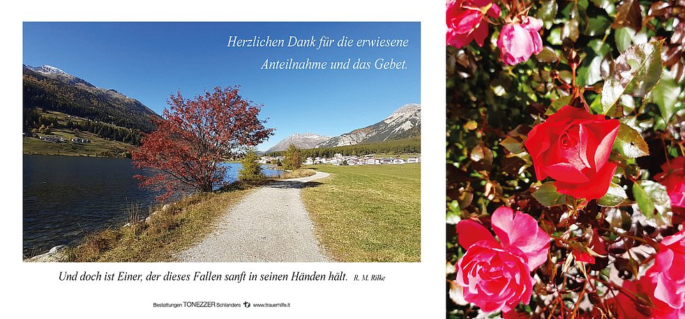 Ein besonderer Dank gilt unserem Hausarzt Dr. Stefan Waldner und seiner Frau Karoline, dem gesamten Team vom Martinsheim in Mals sowie dem Personal des Krankenhauses von Schlanders für die liebevolle und fürsorgliche Betreuung.