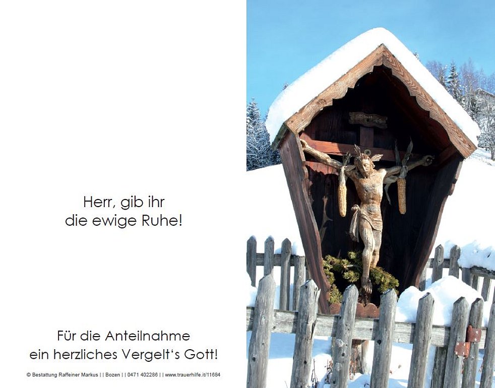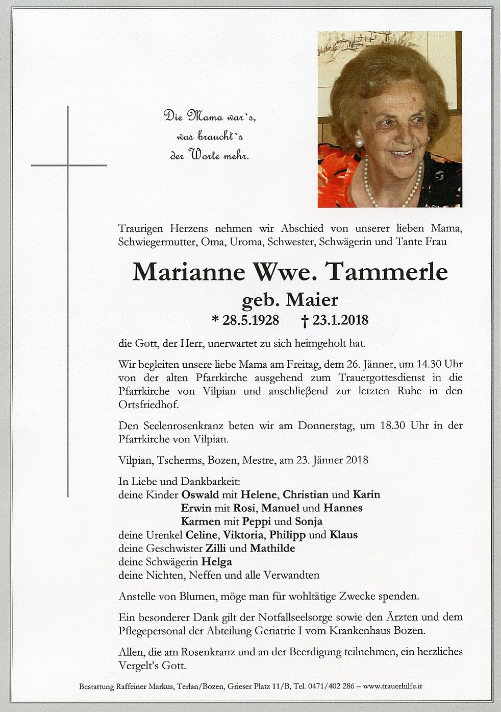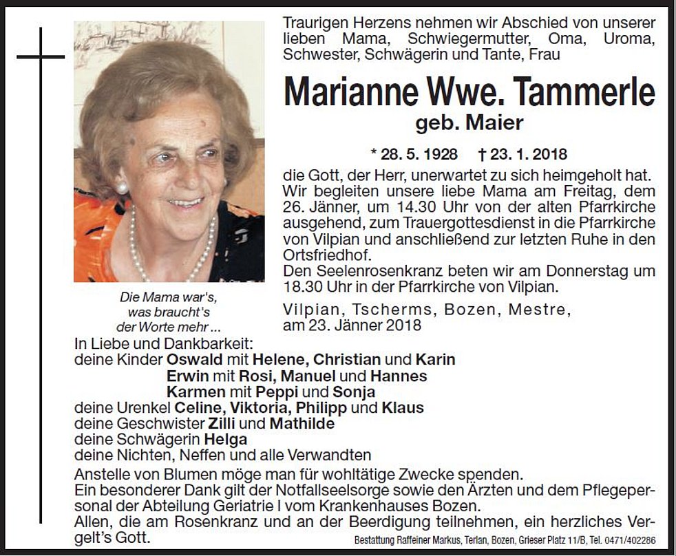 Wir begleiten unsere liebe Mama am Freitag, dem 26. Jänner, um 14.30 Uhr von der alten Pfarrkirche ausgehend zum Trauergottesdienst in die Pfarrkirche von Vilpian und anschlieβend zur letzten Ruhe in den Ortsfriedhof.
