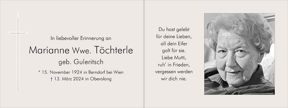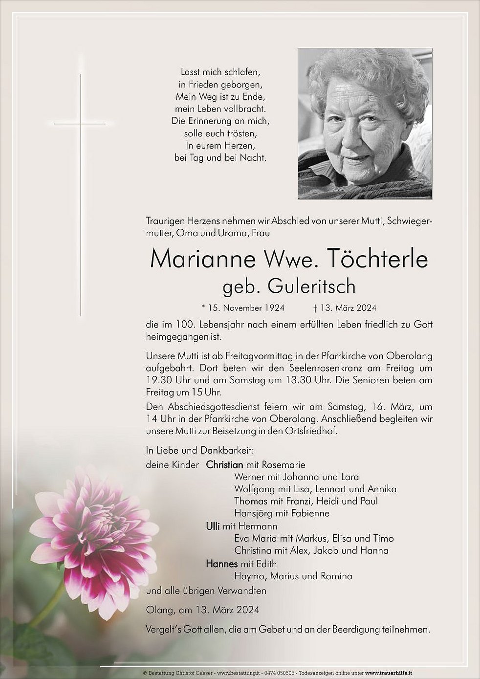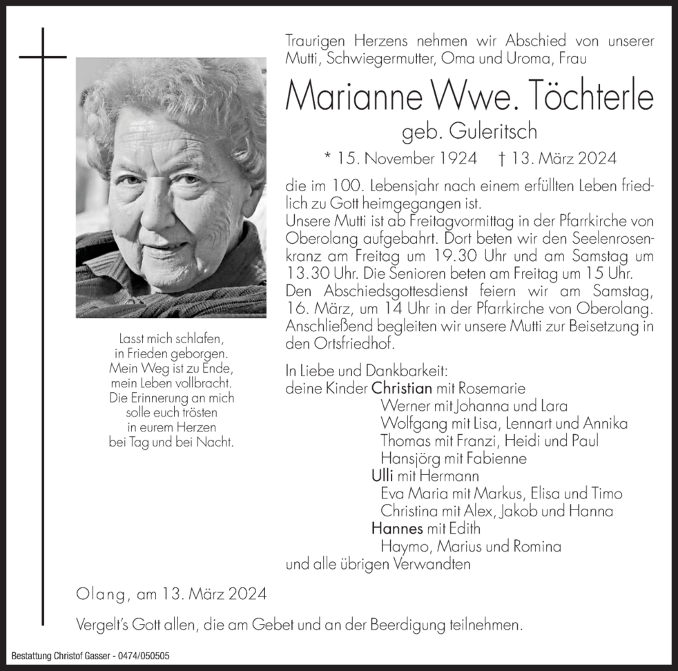 Den Abschiedsgottesdienst feiern wir am Samstag, 16. März, um 14 Uhr in der Pfarrkirche von Oberolang. Anschließend begleiten wir unsere Mutti zur Beisetzung in den Ortsfriedhof.