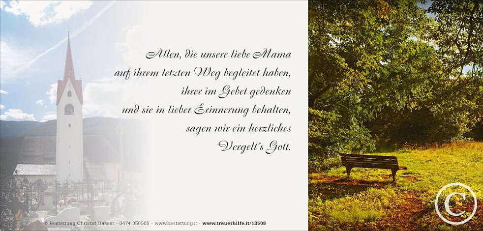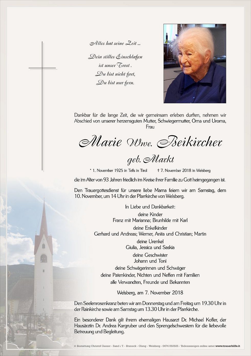 Den Trauergottesdienst für unsere liebe Mama feiern wir am Samstag, dem 10. November, um 14 Uhr in der Pfarrkirche von Welsberg.