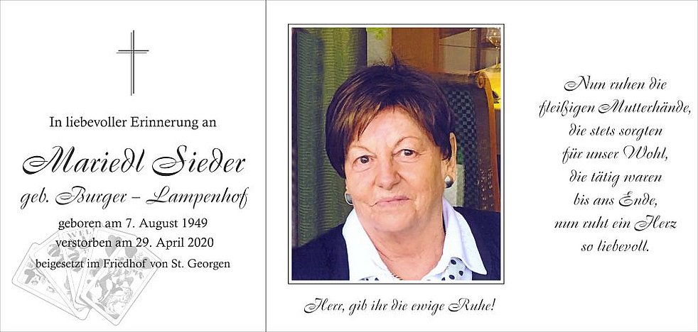 Die Verabschiedung mit anschließender Beisetzung findet im engsten Familienkreis im Friedhof von St. Georgen statt.