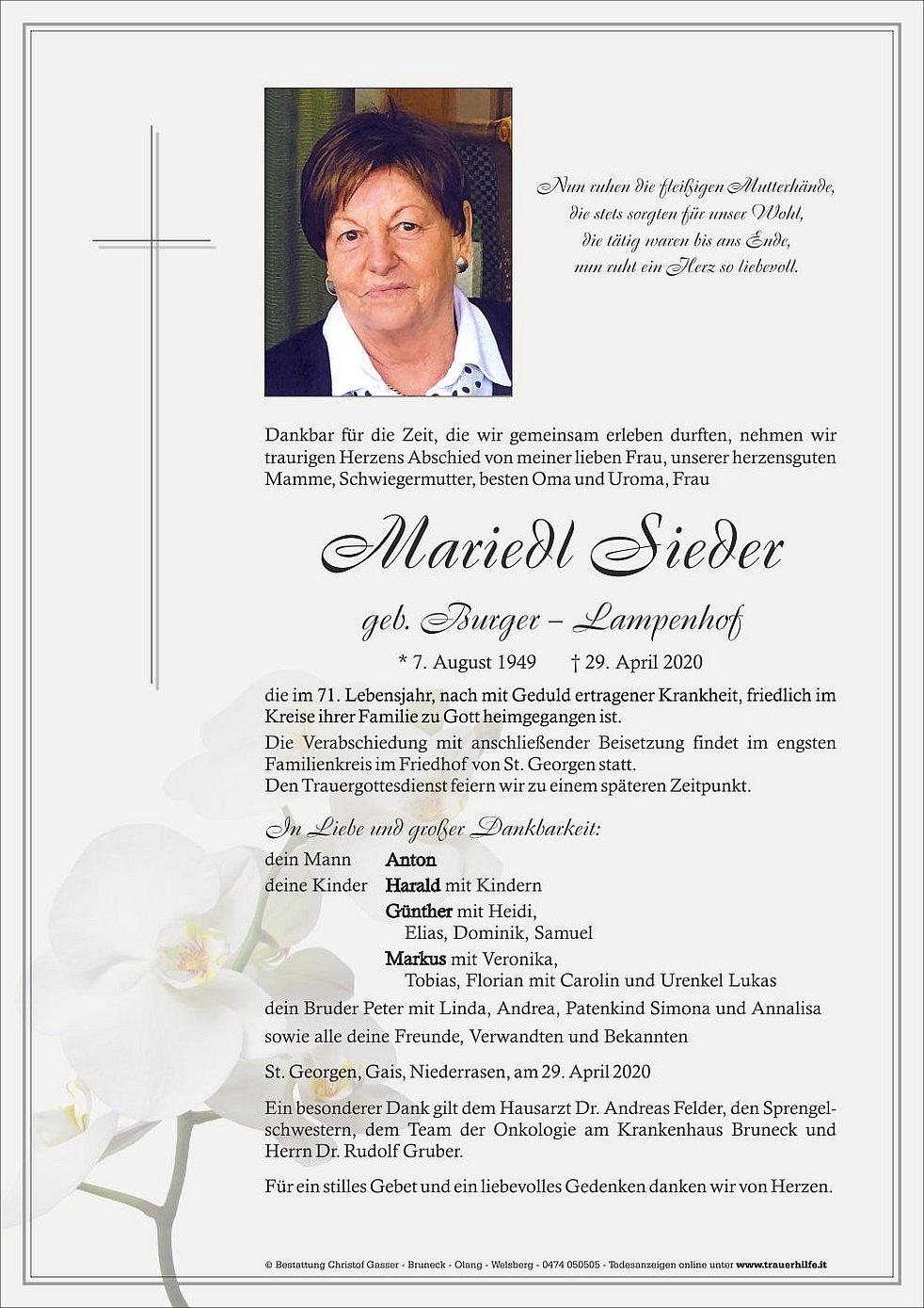 Ein besonderer Dank gilt dem Hausarzt Dr. Andreas Felder, den Sprengelschwestern, dem Team der Onkologie am Krankenhaus Bruneck und Herrn Dr. Rudolf Gruber.