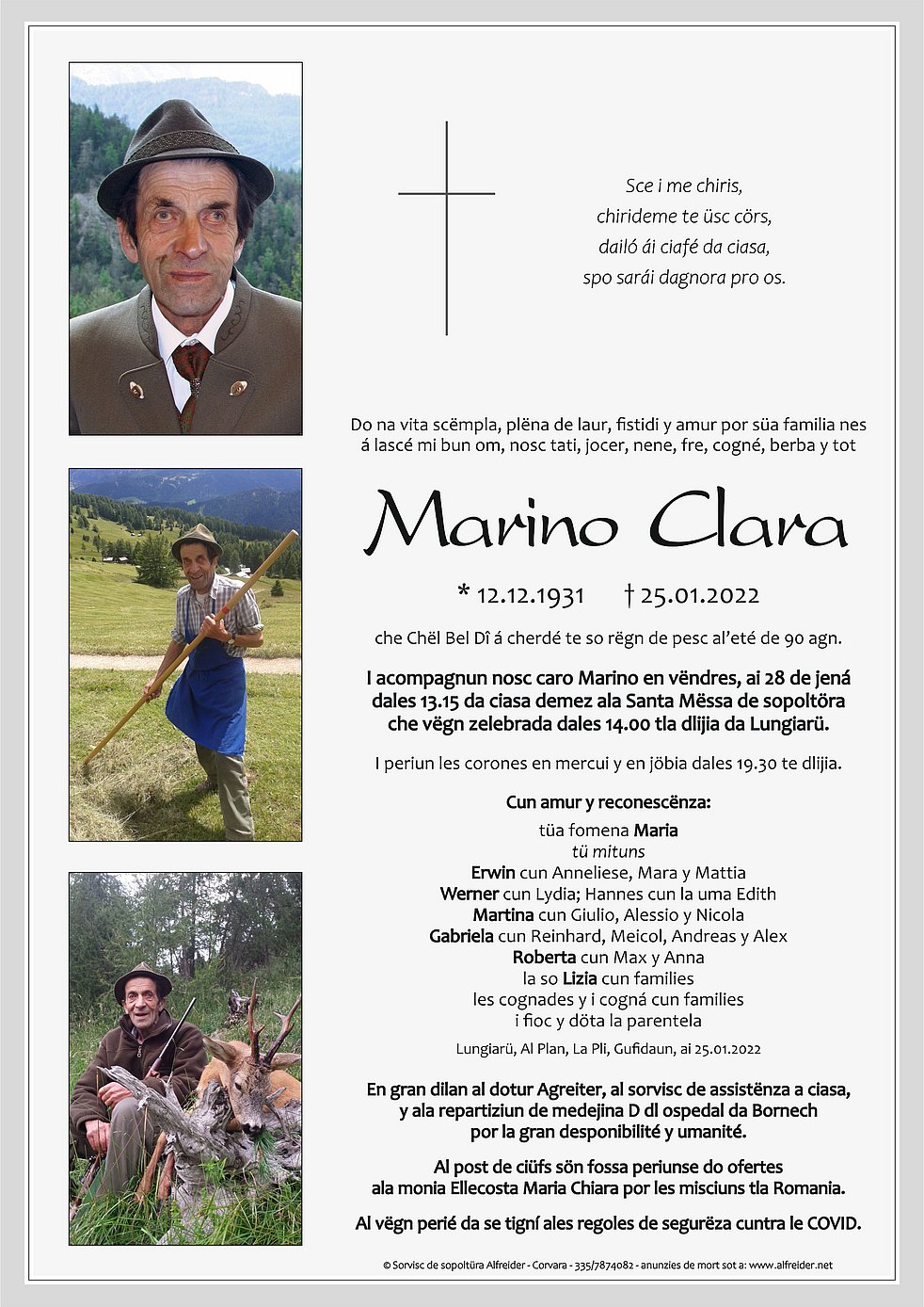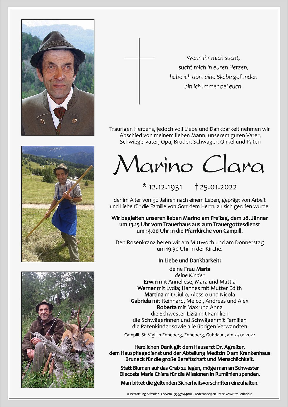 Wir begleiten unseren lieben Marino am Freitag, dem 28. Jänner um 13.15 Uhr vom Trauerhaus aus zum Trauergottesdienst um 14.00 Uhr in die Pfarrkirche von Campill.
