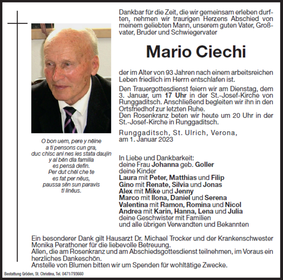 Den Trauergottesdienst feiern wir am Dienstag, dem 03. Januar, um 17 Uhr in der St.-Josef-Kirche in Runggaditsch. Anschließend begleiten wir ihn in den Ortsfriedhof zur letzten Ruhe.