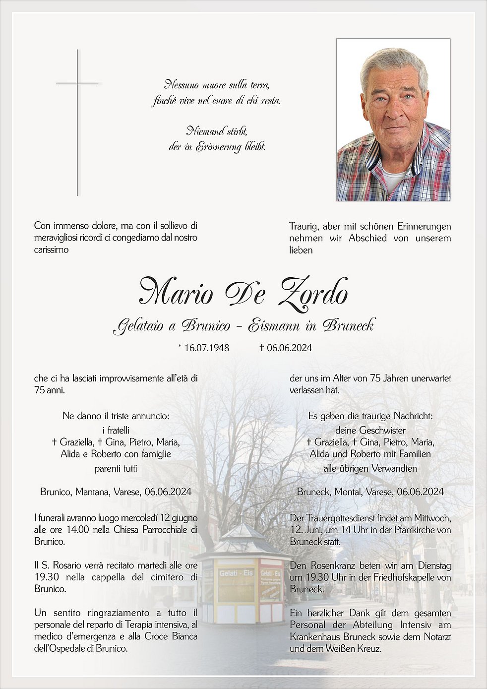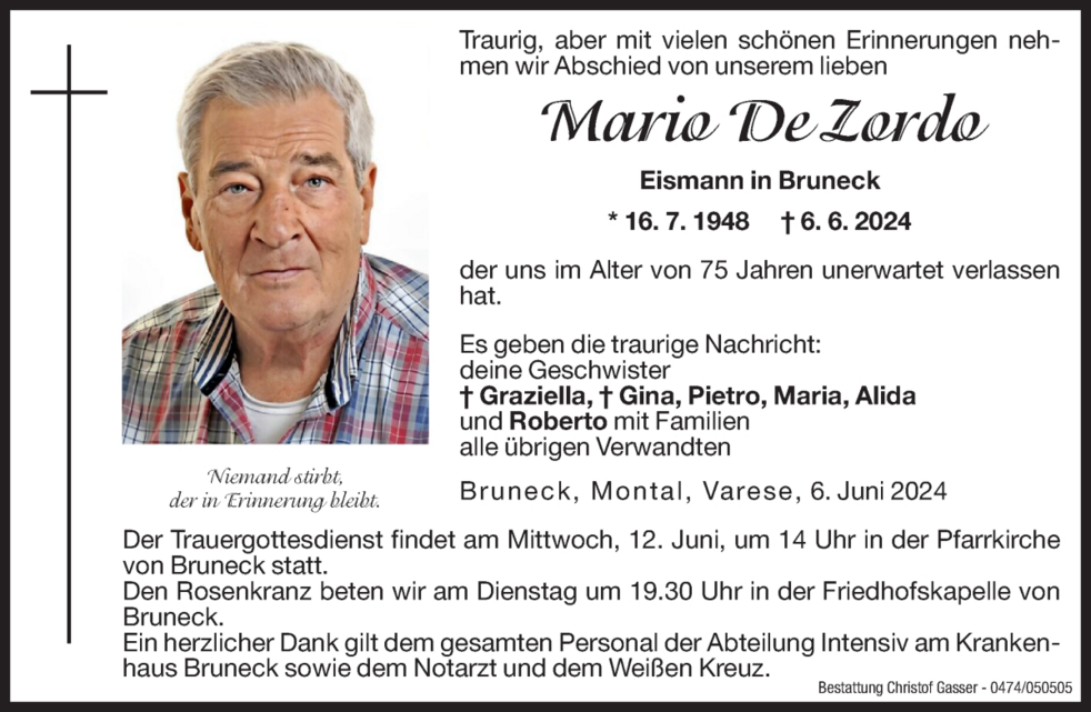 Der Trauergottesdienst findet am Mittwoch, 12. Juni, um 14 Uhr in der Pfarrkirche von Bruneck statt.