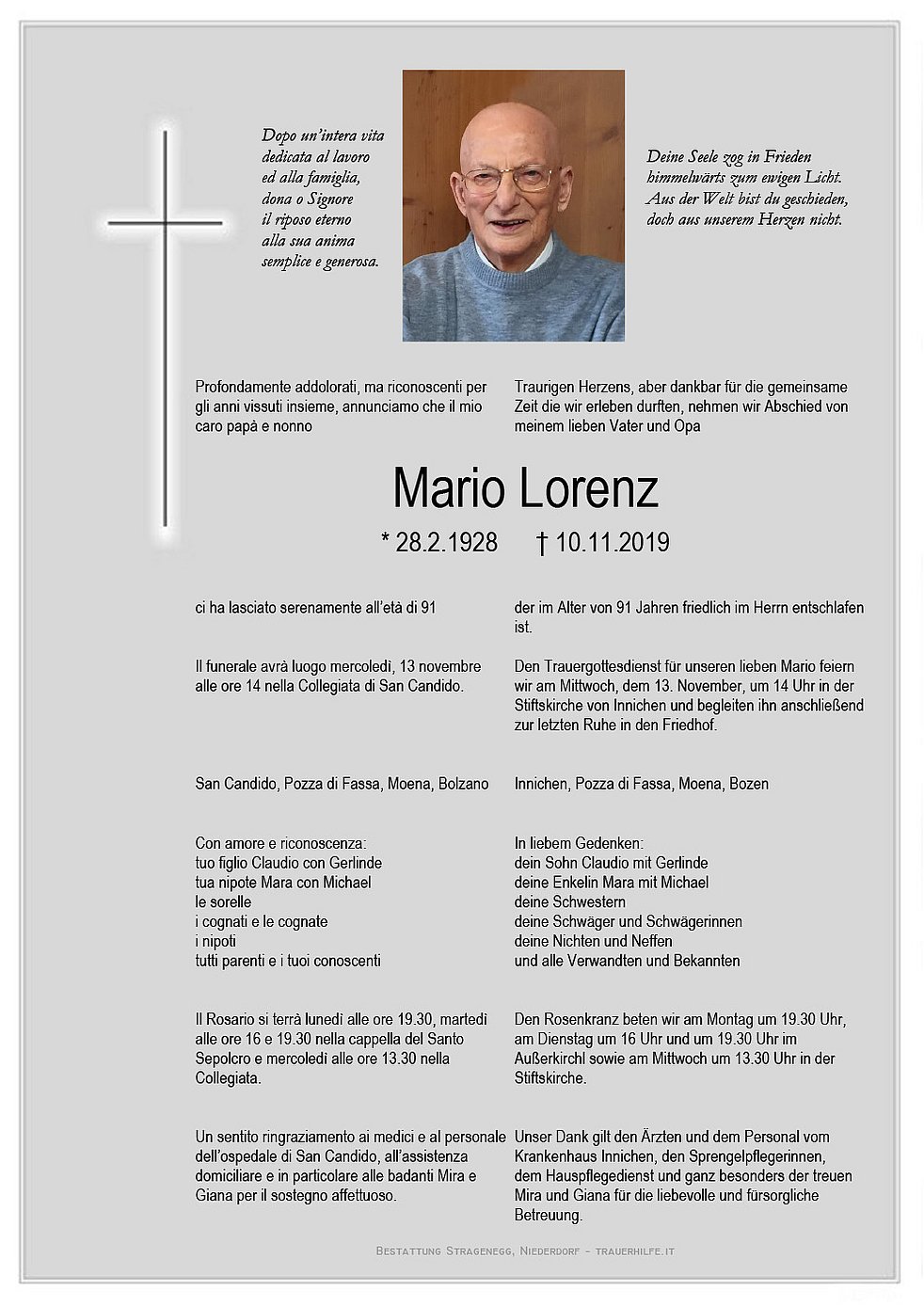 Den Trauergottesdienst für unseren lieben Mario feiern wir am Mittwoch, dem 13. November, um 14 Uhr in der Stiftskirche von Innichen und begleiten ihn anschließend zur letzten Ruhe in den Friedhof.