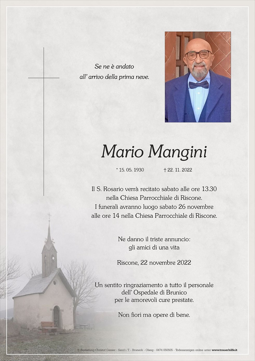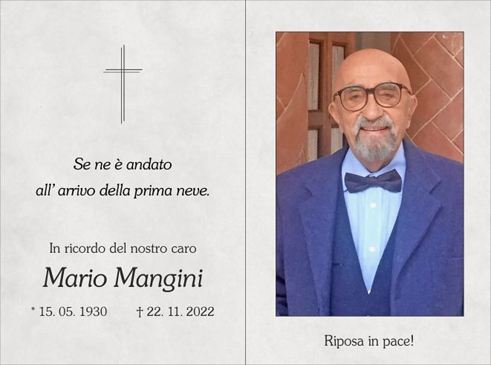 I funerali avranno luogo sabato 26 novembre alle ore 14 nella Chiesa Parrocchiale di Riscone.