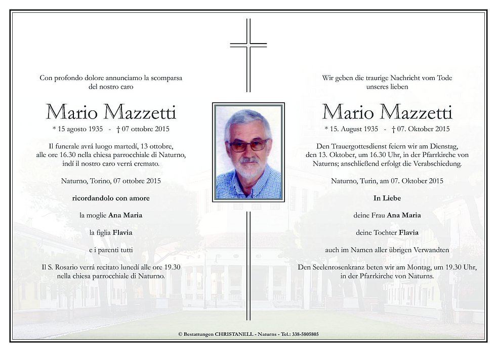 Il funerale avrá luogo martedí, 13 ottobre, alle ore 16.30 nella chiesa parrocchiale di Naturno,