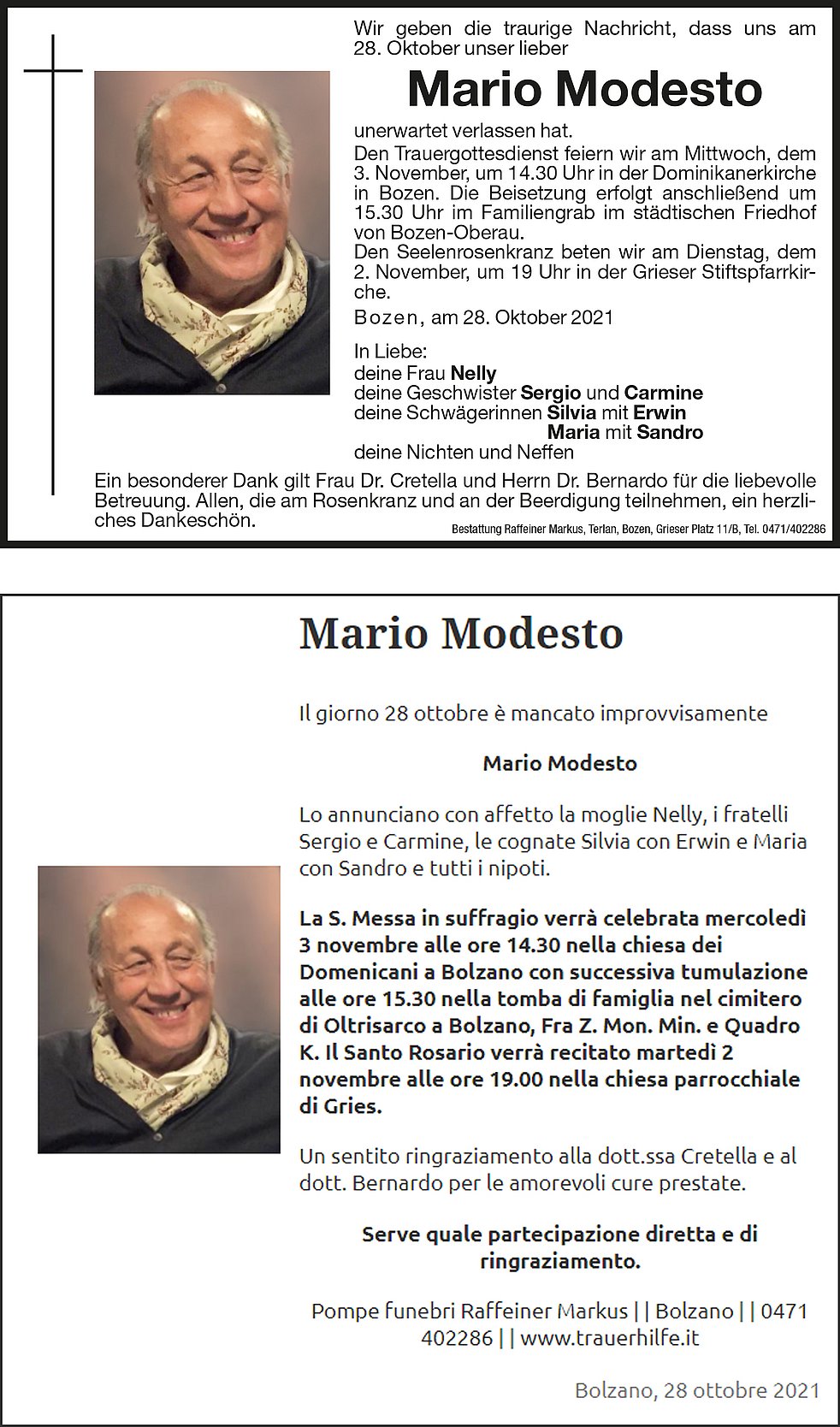 La S. Messa in suffragio verrà celebrata mercoledì 3 novembre alle ore 14.30 nella chiesa dei Domenicani a Bolzano con successiva tumulazione alle ore 15.30 nella tomba di famiglia nel cimitero di Oltrisarco a Bolzano, Fra Z. Mon. Min. e Quadro K.