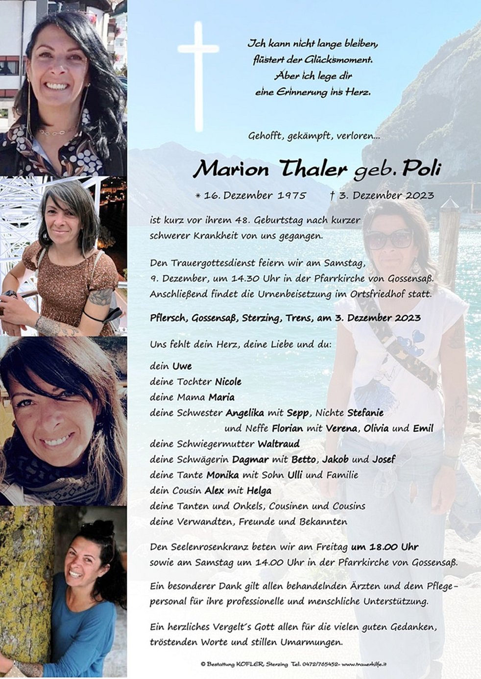 Den Trauergottesdienst feiern wir am Samstag, 9. Dezember, um 14.30 Uhr in der Pfarrkirche von Gossensaß. Anschließend findet die Urnenbeisetzung im Ortsfriedhof statt.