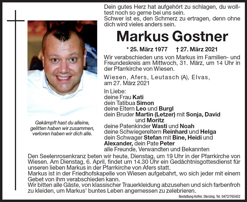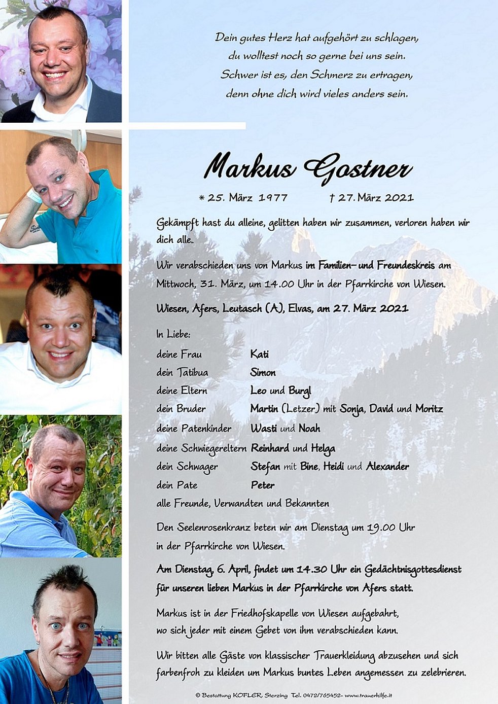 Am Dienstag, 6. April, findet um 14.30 Uhr ein Gedächtnisgottesdienst für unseren lieben Markus in der Pfarrkirche von Afers statt.