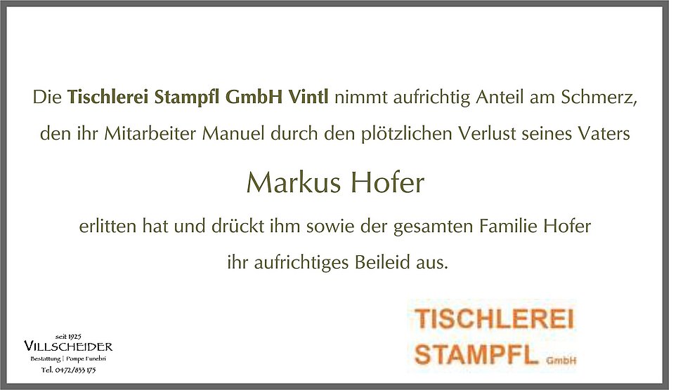 der plötzliche und undenkbare Verlust eures lieben Ehemannes, Sohnes und Vaters Markus Hofer hat mich schwer getroffen.